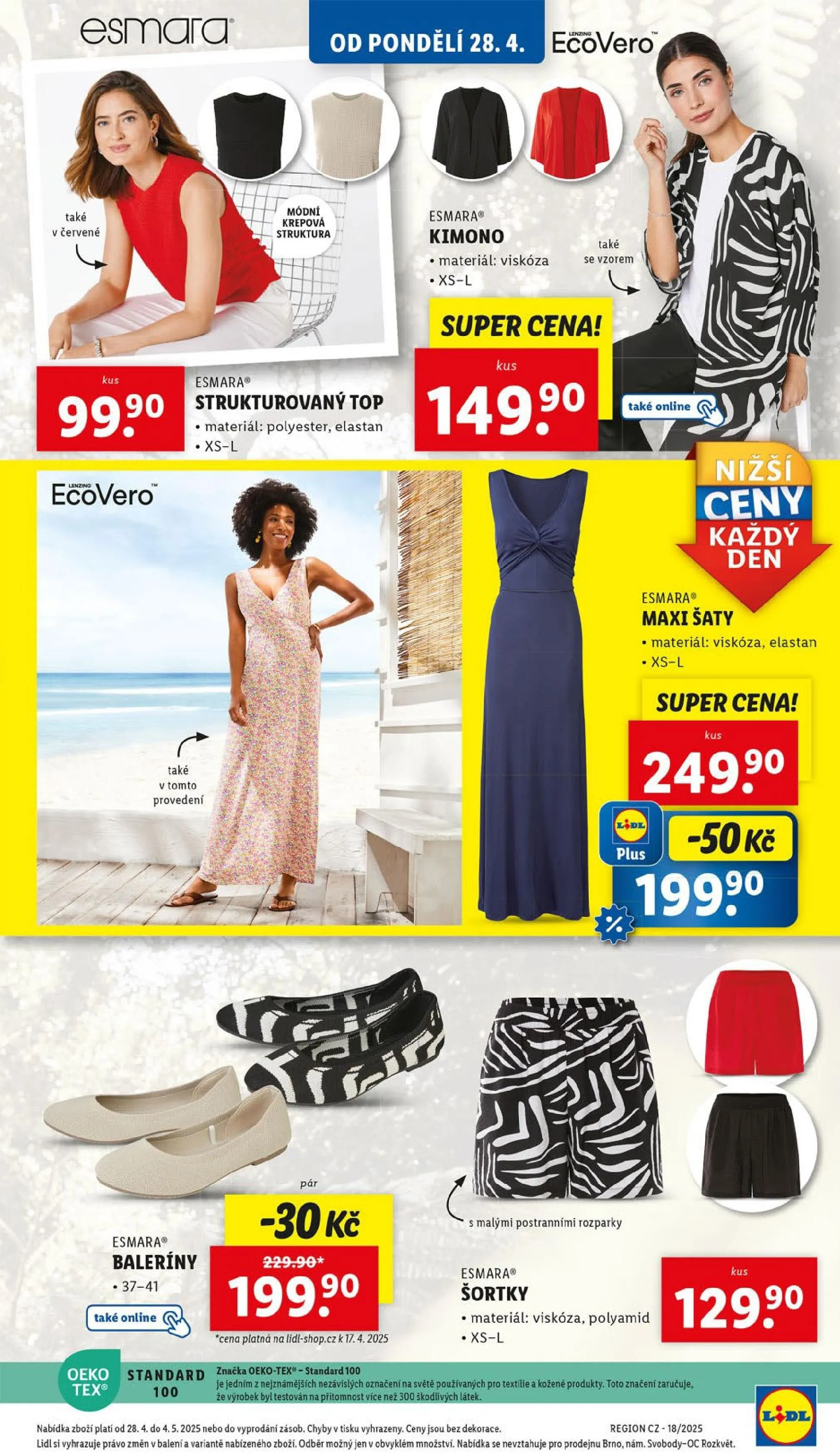 Od pondělí 28.4. v obchodech Lidl najdete skvělou nabídku módních kousků značky esmara. Mezi novinkami jsou stylové krepové topy, kimona a maxi šaty vyrobené z kvalitní viskózy a elastanu, dostupné ve velikostech XS-L.
