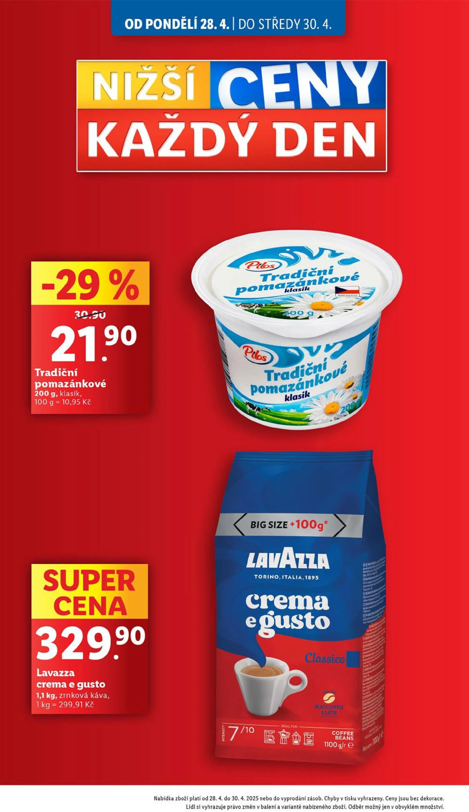 Od pondělí 28.4. do středy 30.4. máte možnost zakoupit skvělé produkty v obchodě Lidl. V nabídce najdete tradiční pomazánkové máslo 200 g za cenu 10,95 Kč. Dále si můžete dopřát zrnkovou kávu Lavazza Crema e Gusto 1,1 kg, která je k dispozici za cenu 299,91 Kč za kilogram. Tato akční nabídka platí do vyprodání zásob. Nezapomeňte, že ceny jsou bez dekorace a Lidl si vyhrazuje právo na změny v balení a variantách nabízeného zboží. Odběr je možný pouze v obvyklém množství.