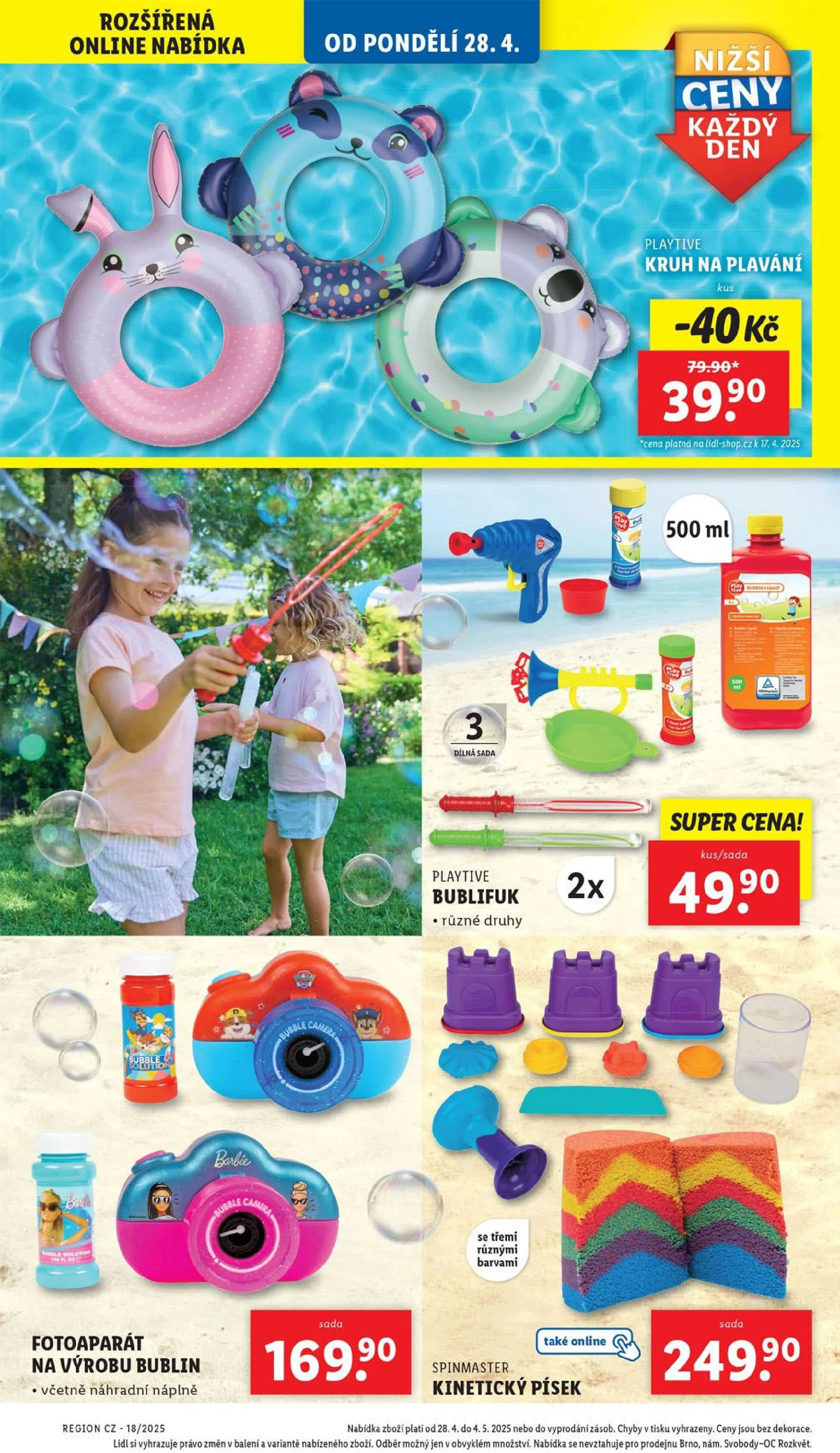V letáku obchodu Lidl najdete skvělou online nabídku, která zahrnuje různé produkty pro zábavu a volný čas. Mezi nimi je fotoaparát na výrobu bublin, který přichází včetně náhradní náplně. Dále si můžete pořídit sadu bublifuků Playtive v několika variantách a barvách. Pro milovníky kreativního hraní je k dispozici kinetický písek od značky Spinmaster. Nezapomeňte také na kruh na plavání Playtive, který je nyní za super cenu. Nabídka platí od 28. dubna do 4. května 2025 nebo do vyprodání zásob. Ceny jsou bez dekorace a Lidl si vyhrazuje právo na změny v balení a variantách nabízeného zboží.