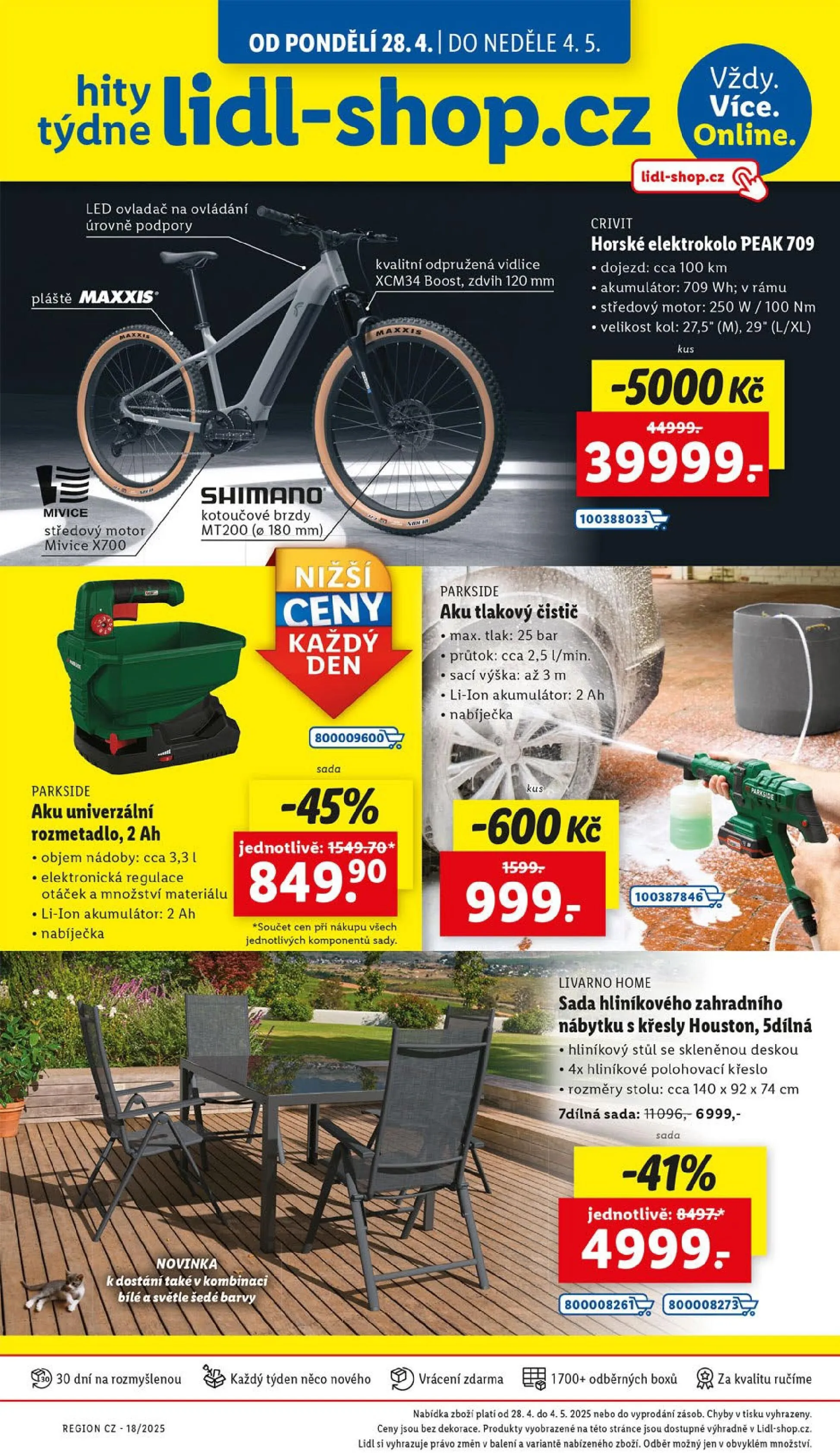 Od pondělí 28.4. do neděle 4.5. si v Lidlu můžete vybrat z široké nabídky produktů. Mezi novinkami najdete horské elektrokolo Peak 709 s dojezdem cca 100 km a středovým motorem o výkonu 250 W. Dále nabízíme aku tlakový čistič s maximálním tlakem 25 bar a průtokem cca 2,5 l/min. Pro milovníky zahrady máme 5dílnou sadu hliníkového zahradního nábytku s polohovacími křesly. Nezapomeňte, že každý týden přinášíme něco nového a vrácení zboží je zdarma. Navštivte náš online obchod na lidl-shop.cz pro více informací!