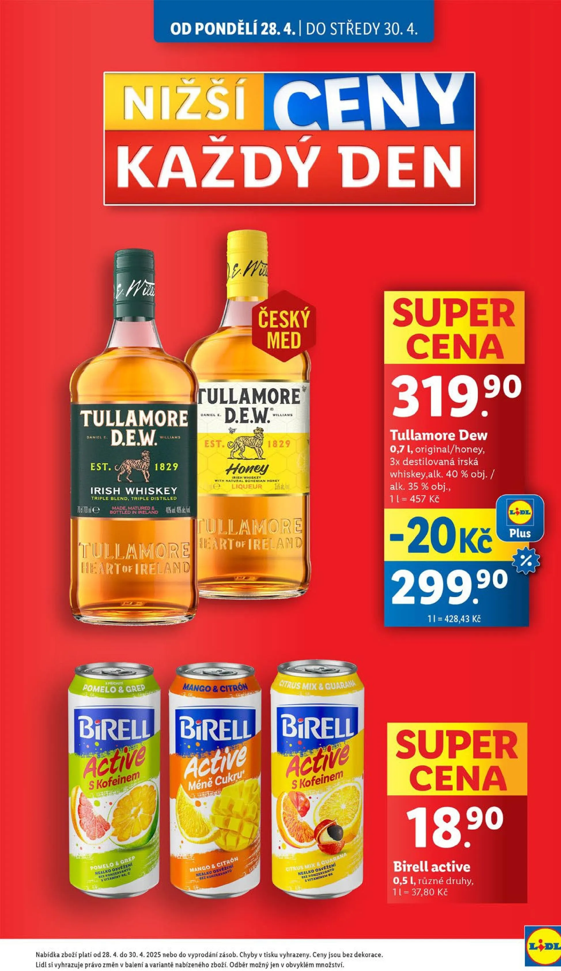 Od pondělí 28.4. do středy 30.4. si nenechte ujít skvělé nabídky v obchodě Lidl! V letáku najdete irskou whiskey Tullamore D.E.W. za super cenu 299,90 Kč za 0,7 l, a to v originální nebo medové variantě. Dále nabízíme Birell Active s kofeinem v různých druzích za 37,80 Kč za 0,5 l. Tato akční nabídka platí do vyprodání zásob, tak neváhejte a přijďte si pro své oblíbené produkty! Ceny jsou uvedeny bez dekorace a Lidl si vyhrazuje právo na změny v balení a variantách zboží.