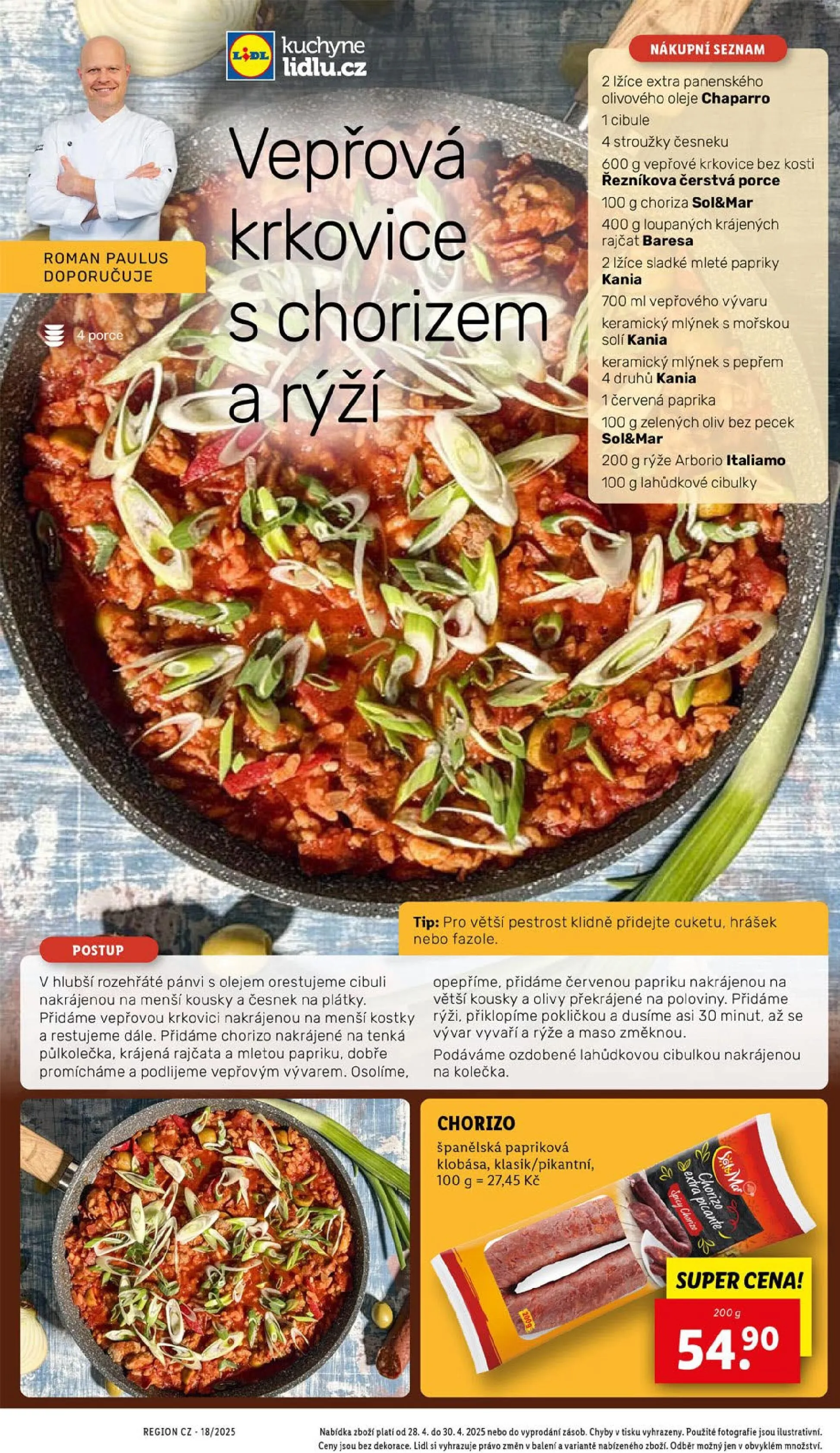 V letáku obchodu Lidl najdete skvělou nabídku na vepřovou krkovici, kterou doporučuje Roman Paulus. K přípravě chutného jídla budete potřebovat také chorizo, cibuli, česnek, rajčata a rýži. Nezapomeňte na extra panenský olivový olej a koření, jako je sladká mletá paprika a mořská sůl.