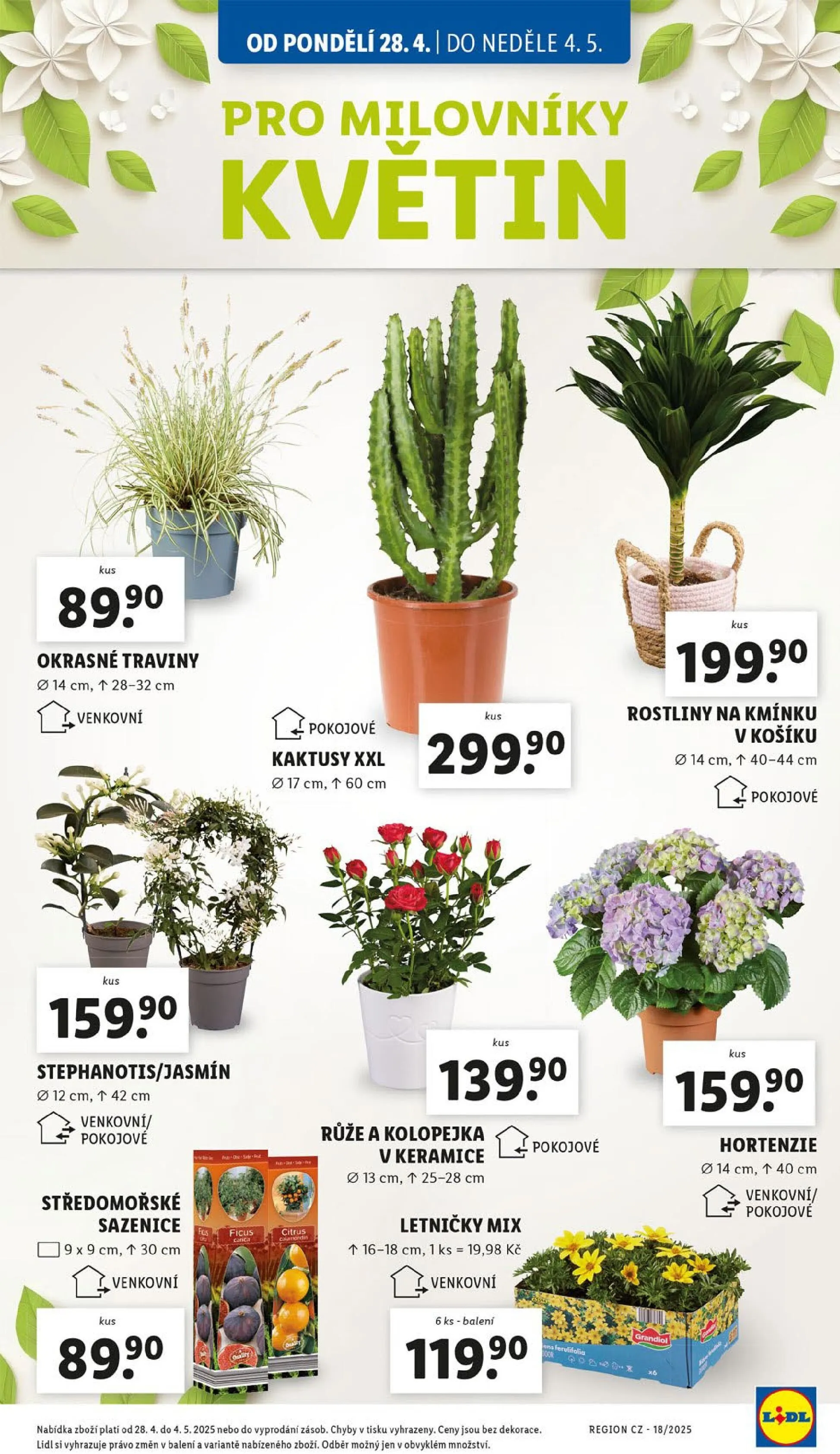 Od pondělí 28.4. do neděle 4.5. si v Lidlu můžete vybrat z široké nabídky květin pro milovníky rostlin. Nabízíme okrasné traviny za 89 Kč, pokojové kaktusy XXL za 299 Kč a stephanotis/jasmín za 159 Kč. Dále máme středomořské sazenice za 89 Kč a růže v keramice za 139 Kč. Nezapomeňte na letničky mix, které jsou k dispozici za 19,98 Kč za kus. V nabídce najdete také rostliny na kmínku a hortenzie. Tato akční nabídka platí do vyprodání zásob.