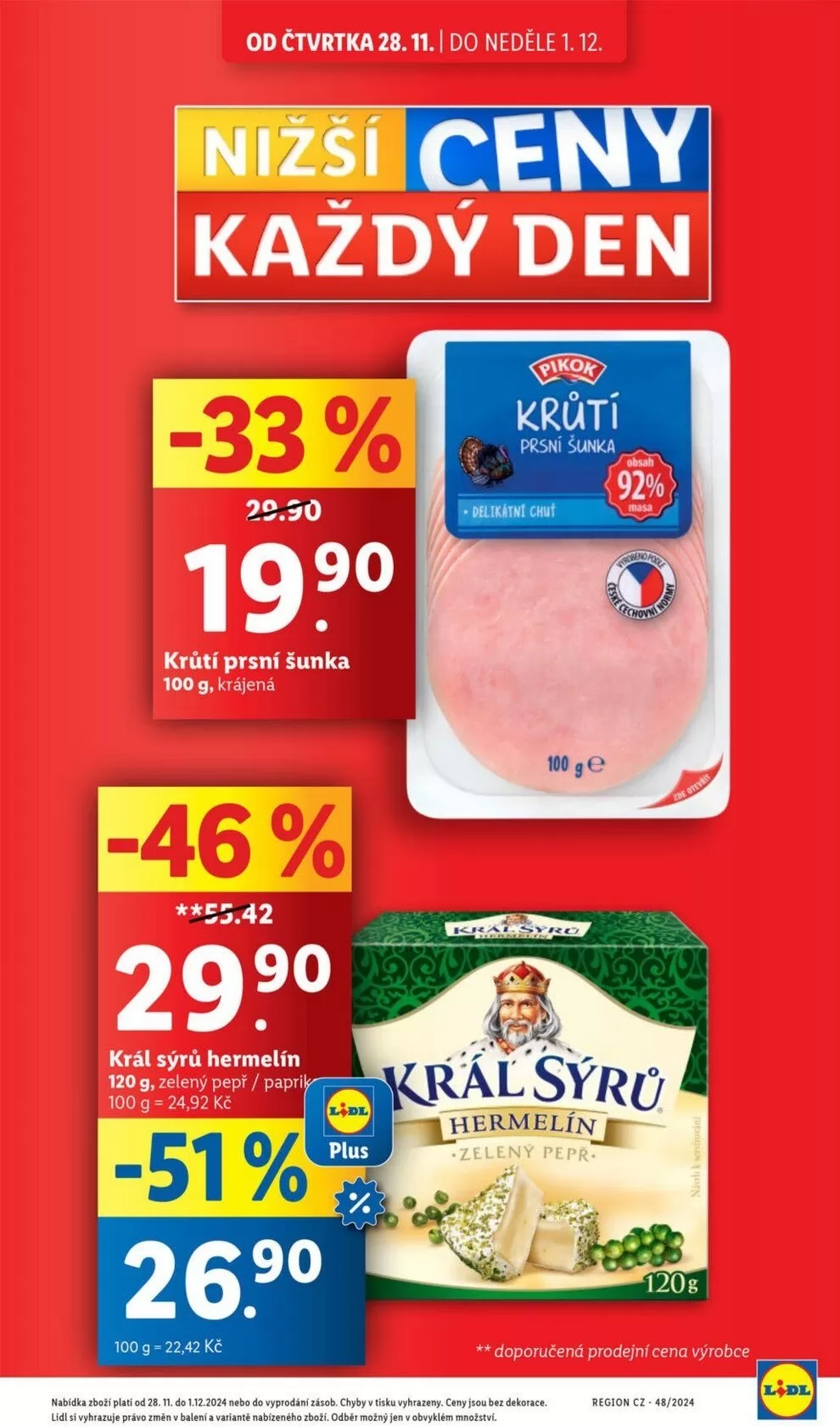 Od čtvrtka 28.11. do neděle 1.12. máte možnost zakoupit skvělé produkty v obchodu Lidl. V nabídce najdete krůtí prsní šunku za 29,30 Kč za 100 g, která je krájená a ideální pro přípravu chutných pokrmů. Dále se můžete těšit na král sýrů hermelín s příchutí zeleného pepře, který je k dostání za 26,90 Kč za 120 g. Nezapomeňte, že nabídka platí do vyprodání zásob. Těšíme se na vaši návštěvu!