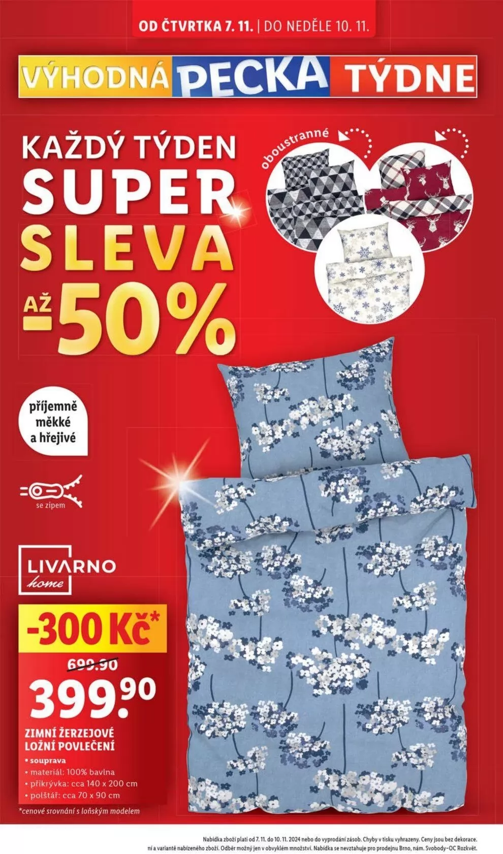 Od čtvrtka 7.11. do neděle 10.11. si v obchodě Lidl můžete pořídit zimní žerzejové ložní povlečení za skvělou cenu. Tato souprava je vyrobena ze 100% bavlny, což zaručuje příjemně měkký a hřejivý pocit. Rozměry přikrývky jsou cca 140 x 200 cm a polštáře cca 70 x 90 cm. Nezapomeňte, že nabídka platí do vyprodání zásob. Těšíme se na vaši návštěvu!
