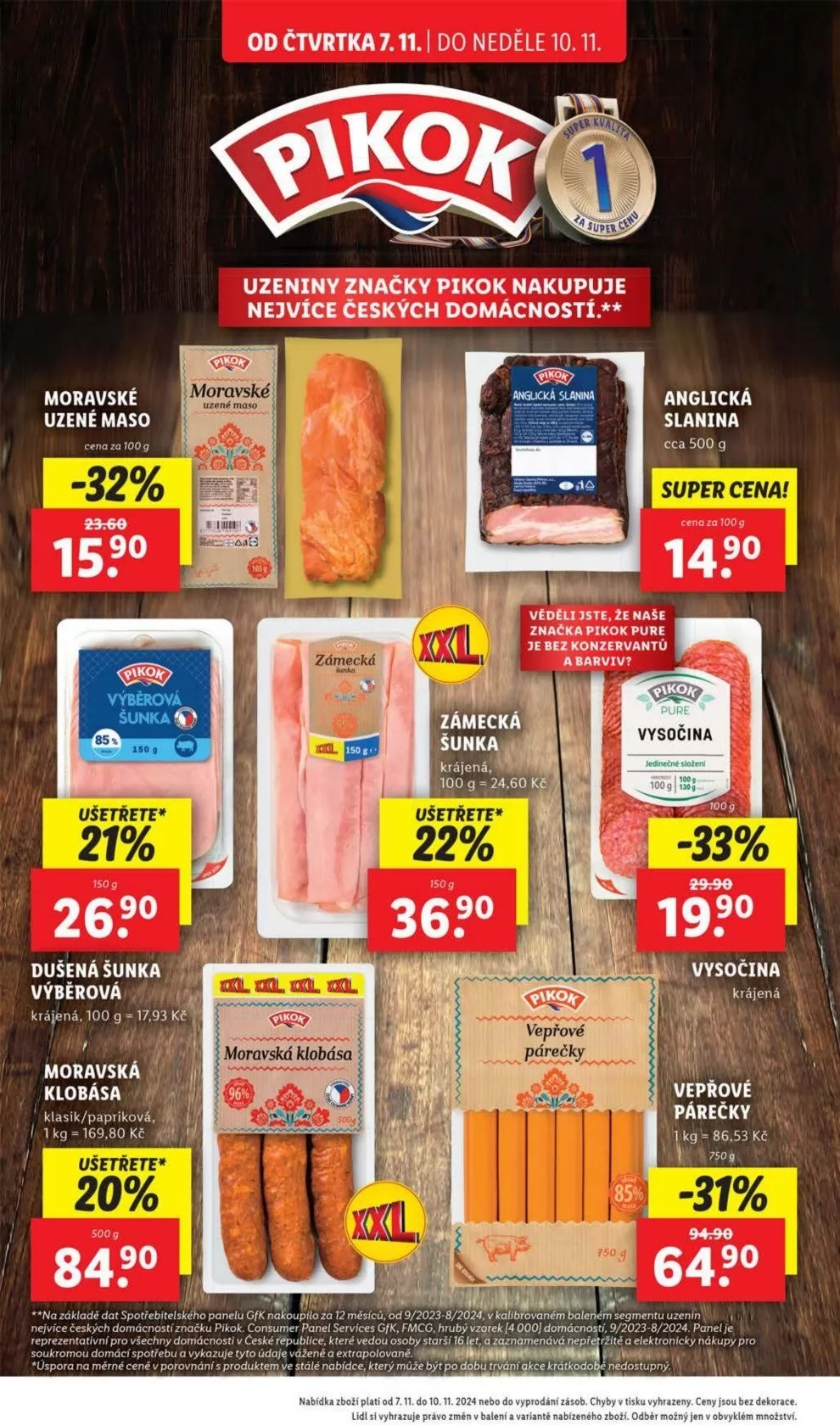 Od čtvrtka 7. do 10. ledna 2024 přichází Lidl s atraktivní nabídkou uzenin značky Pikok. V letáku najdete moravské uzené maso za skvělou cenu 32% sleva, výběrovou šunku a dušenou šunku, která je k dostání za 17,93 Kč za 100 g. Moravská klobása, ať už klasická nebo papriková, je nabízena za 169,80 Kč za 1 kg.