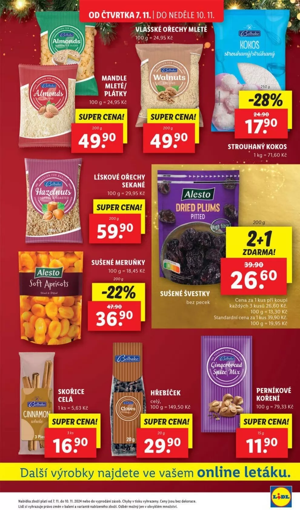 Nezapomeňte na strouhaný kokos, který je k dostání za 71,60 Kč za 1 kg. A pokud máte rádi koření, perníkové koření je nyní za 79,33 Kč za 100 g.