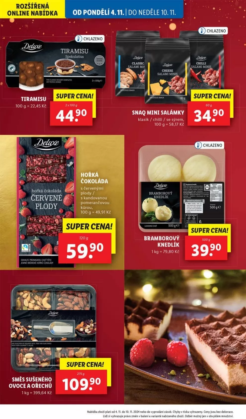 V letáku obchodu Lidl na období od pondělí 4.11. do neděle 10.11. najdete širokou nabídku skvělých produktů. Mezi nimi se objevuje lahodné chlazené tiramisu za super cenu 22,45 Kč za 100 g. Dále si můžete vychutnat mini salámky Snaq v různých variantách – klasické, chilli nebo se sýrem, které stojí 58,17 Kč za 100 g.