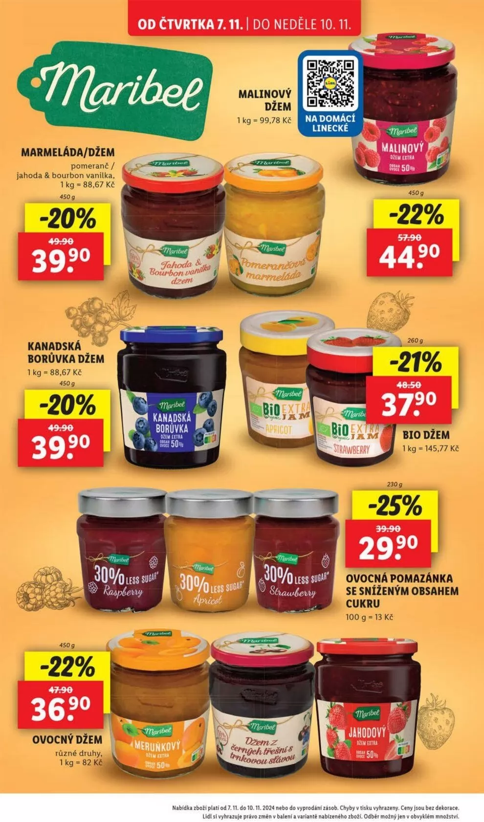 Od čtvrtka 7.11. do neděle 10.11. máte možnost zakoupit různé druhy ovocných džemů a marmelád v akci. Malinový džem za 99,78 Kč za 1 kg, pomerančová a jahodová marmeláda s bourbon vanilkou za 88,67 Kč za 1 kg. Kanadská borůvka také za 88,67 Kč za 1 kg. Dále nabízíme ovocný džem s borůvkami za 36 Kč za 300 g a bio džem za 145,77 Kč za 1 kg. Pro milovníky zdravějších variant je k dispozici ovocná pomazánka se sníženým obsahem cukru za 13 Kč za 100 g. Nezapomeňte, že nabídka platí do vyprodání zásob.