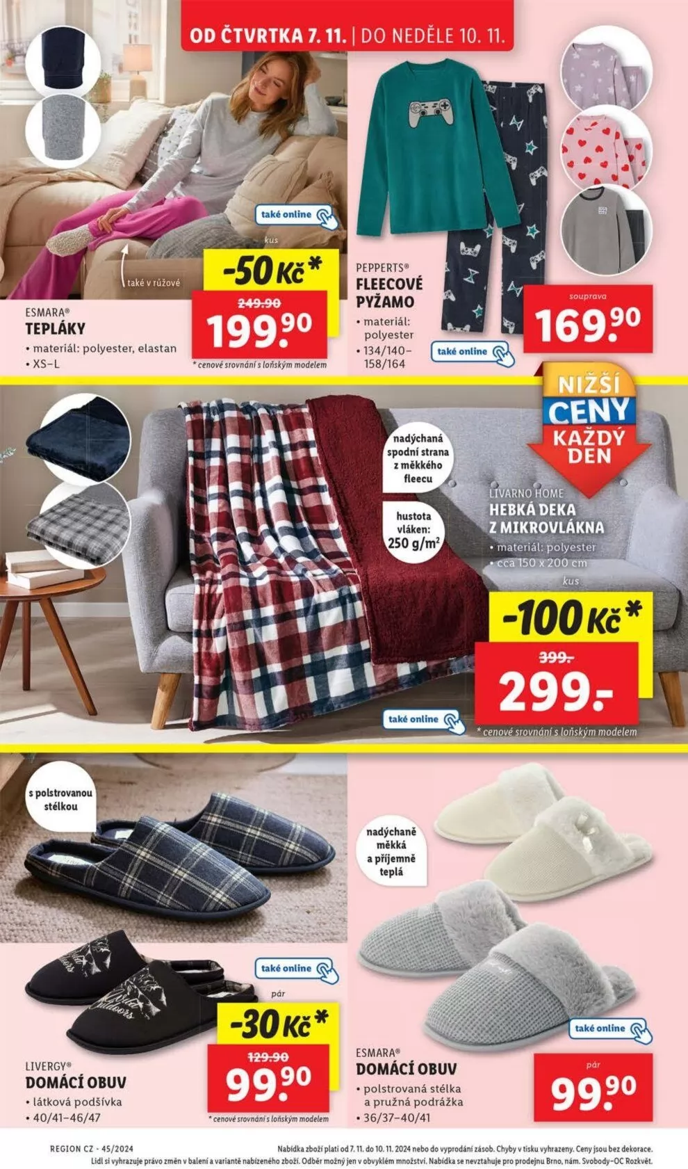 Od čtvrtka 7.11. do neděle 10.11. si můžete v Lidlu pořídit skvělé produkty za výhodné ceny. Nabízíme tepláky Esmara vyrobené z polyesteru a elastanu v velikostech XS-L. Dále domácí obuv Livergy s polstrovanou stélkou a látkovou podšívkou, dostupnou ve velikostech 40/41-46/47.