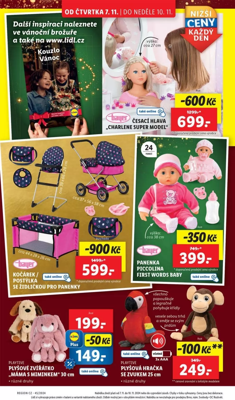 Od čtvrtka 7.11. do neděle 10.11. můžete v obchodu Lidl objevit širokou nabídku vánočních produktů. V letáku najdete inspiraci na dárky, jako je česací hlava „Charlene Super Model” za 699 Kč, panenka Piccolina za 399 Kč a postýlka se židličkou pro panenky za 149 Kč. Dále se můžete těšit na plyšové zvířátko „Mama s miminkem” za 249 Kč, které se pohybuje a vydává zvuky. Nezapomeňte také navštívit naši vánoční brožuru a webové stránky www.lidl.cz pro další nabídky. Všechny ceny jsou platné do vyprodání zásob.