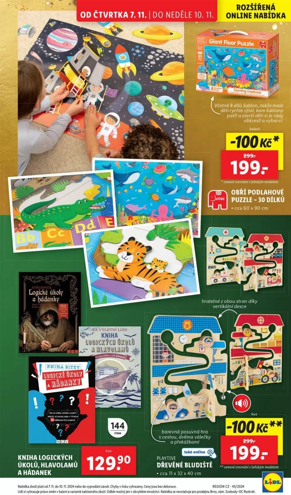 Od čtvrtka 7.11. do neděle 10.11. si můžete v Lidlu pořídit rozšířenou online nabídku. Mezi zajímavé produkty patří obří podlahové puzzle s 30 dílky, které měří cca 60 x 90 cm a je hratelné z obou stran. Dále nabízíme knihu logických úkolů a hádanek, která obsahuje 144 kusů. Pro malé děti je připravena barevná posuvná hra s cestou, dvěma válečky a překážkami. Nezapomeňte také na dřevěné bludiště Playtive, které má rozměry cca 11 x 32 x 40 cm. Nabídka platí do vyprodání zásob. Těšíme se na vaši návštěvu!