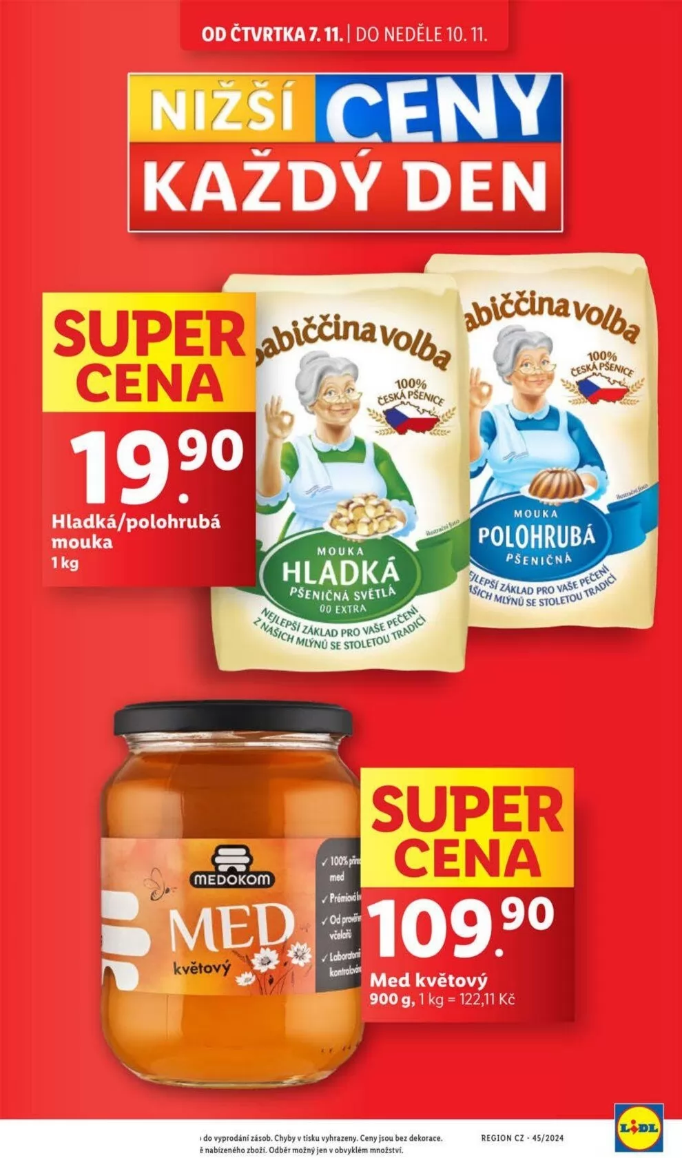 Od čtvrtka 7.11. do neděle 10.11. přichází Lidl s výhodnými nabídkami! V letáku najdete hladkou a polohrubou pšeničnou mouku, která je ideálním základem pro vaše pečení. Cena za 1 kg je velmi příznivá. Dále si můžete pořídit květový med o hmotnosti 900 g za skvělou cenu 109,90 Kč. Nezapomeňte, že nabídka platí do vyprodání zásob. Těšíme se na vaši návštěvu!