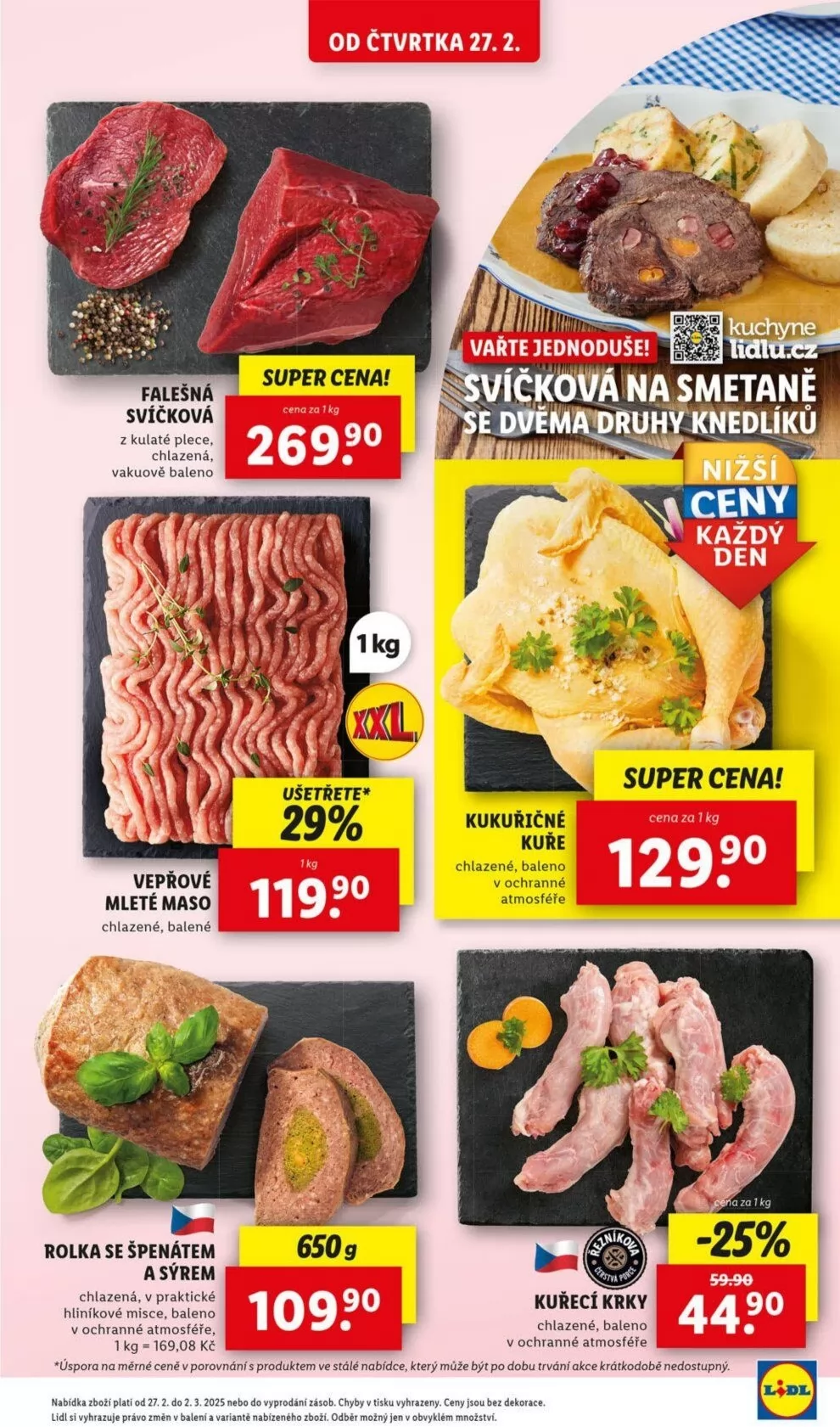 Od čtvrtka 27.2. v obchodech Lidl najdete skvělé akční nabídky! Mezi nimi je falešná svíčková z kulaté plece, chlazená a vakuově balená. Dále nabízíme vepřové mleté maso, které je také chlazené a balené. Nezapomeňte vyzkoušet rolku se špenátem a sýrem, která je chlazená a balena v praktické hliníkové misce.