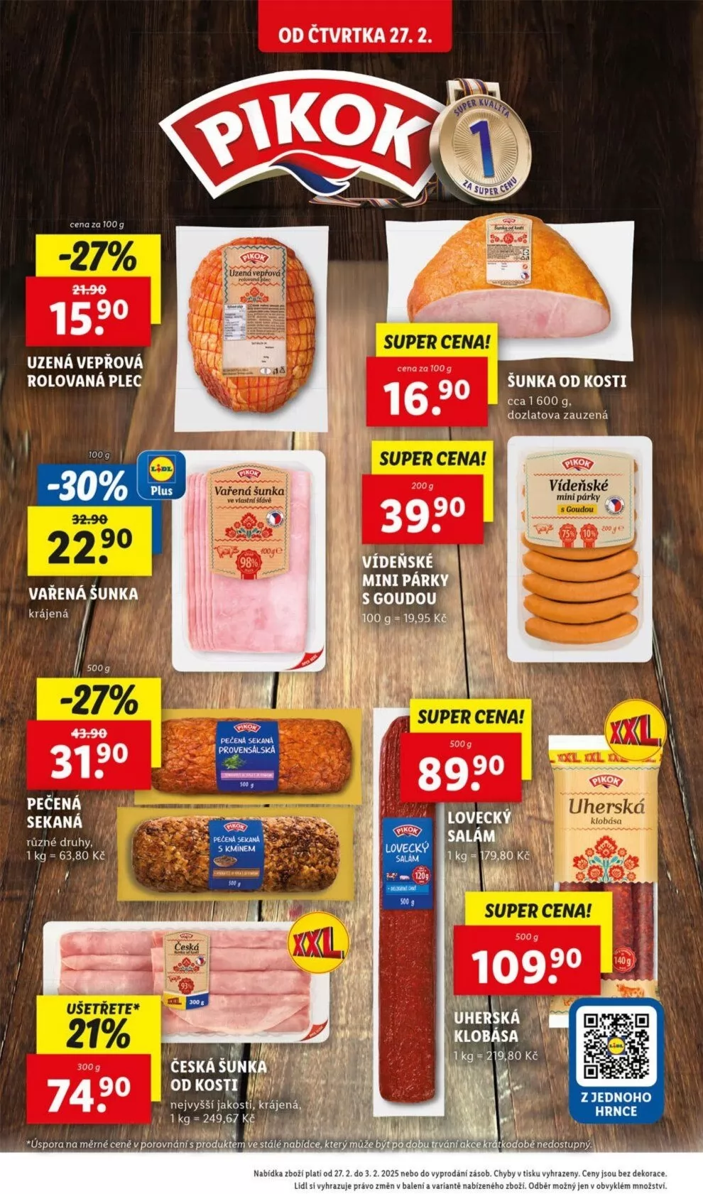 V letáku obchodu Lidl najdete skvělé akční nabídky na různé masné výrobky. Od čtvrtka 27.2. si můžete zakoupit uzenou vepřovou rolovanou plec se slevou 27%. Dále je v nabídce vařená šunka krájená v balení 500 g a vídeňské mini párky s goudou. Nezapomeňte také na pečenou sekanou a lovecký salám, které jsou k dostání v různých variantách. Všechny produkty jsou za super ceny a platí do vyprodání zásob. Navštivte Lidl a využijte těchto skvělých nabídek!