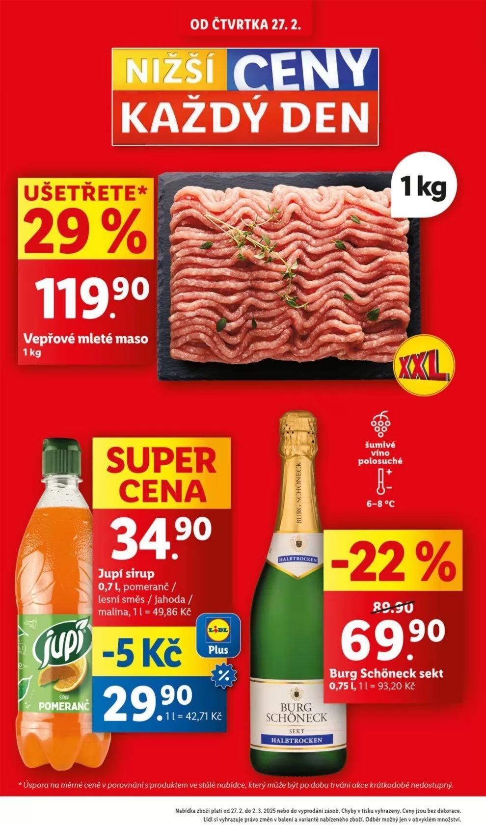 Od čtvrtka 27.2. přichází Lidl s atraktivními nabídkami! Ušetřete až 29% na vepřovém mletém mase, které je nyní za skvělou cenu 119,90 Kč za 1 kg. Nezapomeňte také na Jupí sirup, který si můžete pořídit za 34,90 Kč za 0,7 l v příchutích pomeranč, lesní směs, jahoda nebo malina. A pro milovníky vína máme šumivé polosuché víno Burg Schöneck za 29,90 Kč za 0,75 l, což představuje úsporu 22%. Nabídka platí do 2.3.2025 nebo do vyprodání zásob. Nepropásněte tyto skvělé akce!
