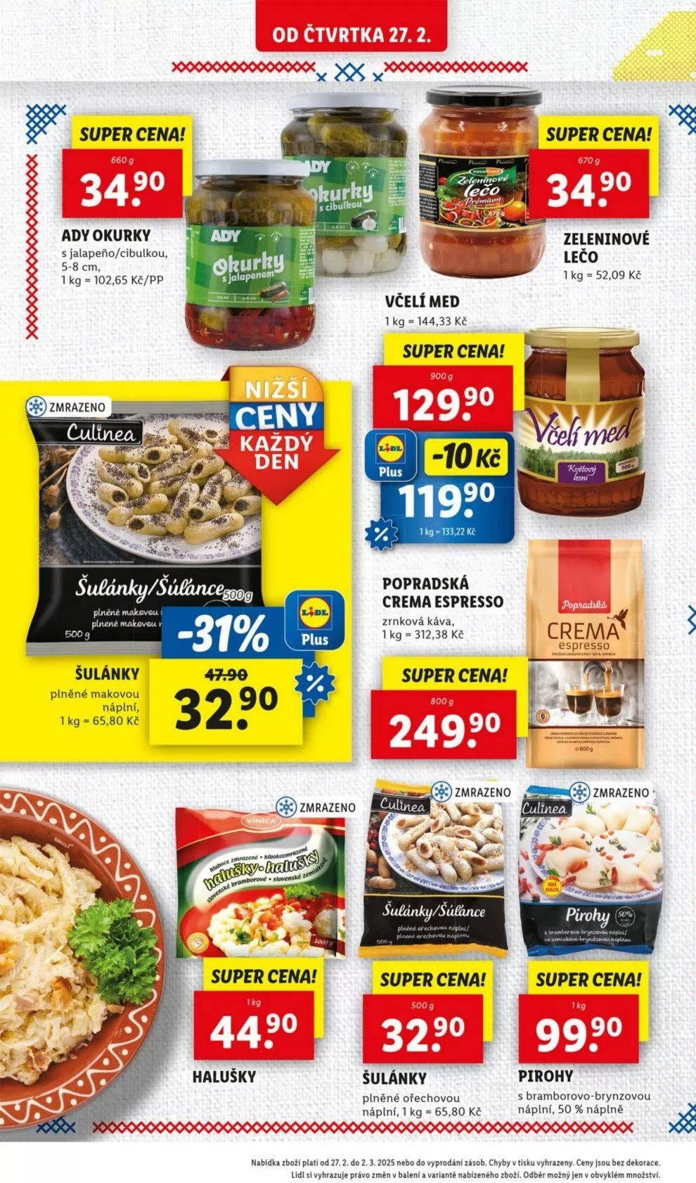 V letáku obchodu Lidl najdete skvělé nabídky na různé produkty! Mezi nimi jsou například okurky s jalapeňo nebo cibulkou, které jsou zmrazené a mají hmotnost 660 g. Dále si můžete vychutnat šulánky plněné makovou nebo ořechovou náplní, každé balení o hmotnosti 500 g. Pro milovníky kávy je k dispozici zrnková káva crema espresso, která je také zmrazená. Nezapomeňte na včelí med a zeleninové lečo, které jsou skvělou volbou pro každodenní vaření. Nabídka platí od 27.2. do 2.3.2025 nebo do vyprodání zásob. Nepropásněte tyto super ceny!