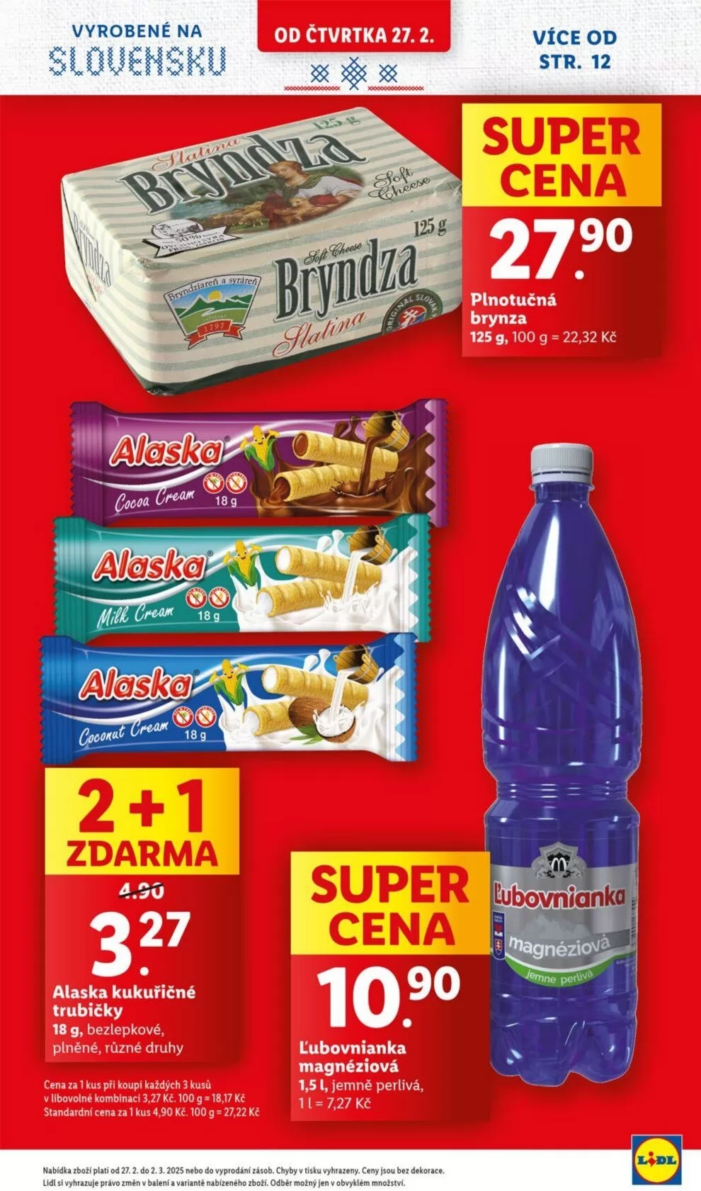 V letáku obchodu Lidl najdete skvělé nabídky na různé produkty. Například bezlepkové kukuřičné trubičky Alaska, které jsou plněné a dostupné v různých druzích. Při koupi tří kusů je cena za jeden kus 3,27 Kč, což je výhodná nabídka. Dále si můžete pořídit jemně perlivou magnéziovou vodu Ľubovnianka v balení 1,5 l za 7,27 Kč. Nezapomeňte také na plnotučnou brynzu, která je k dostání v balení 125 g za 27,90 Kč. Tato nabídka platí od 27. února do 2. března 2025 nebo do vyprodání zásob. Ceny jsou uvedeny bez dekorací a Lidl si vyhrazuje právo na změny v nabídce.