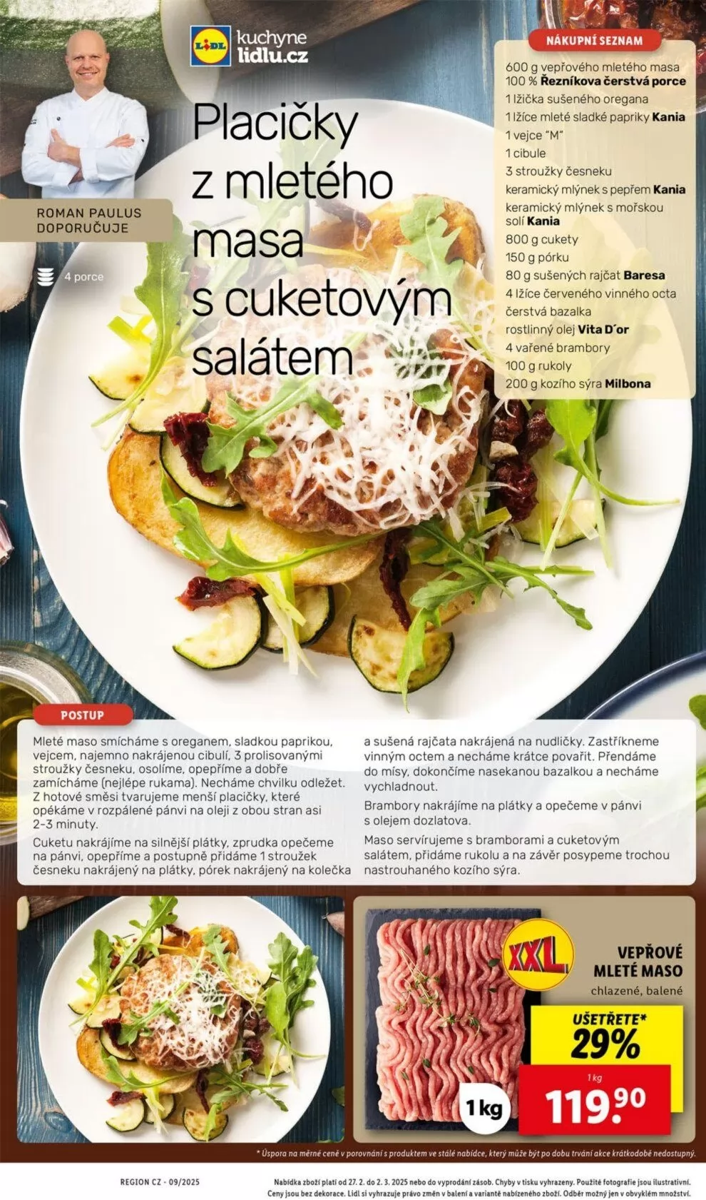 V letáku obchodu Lidl najdete skvělou nabídku na vepřové mleté maso, které je chlazené a balené. Můžete si připravit chutné placičky z mletého masa s cuketovým salátem. K tomu budete potřebovat 600 g vepřového mletého masa, sušené oregano, sladkou papriku, vejce, cibuli, česnek a další ingredience jako cuketu, pórek a sušená rajčata.