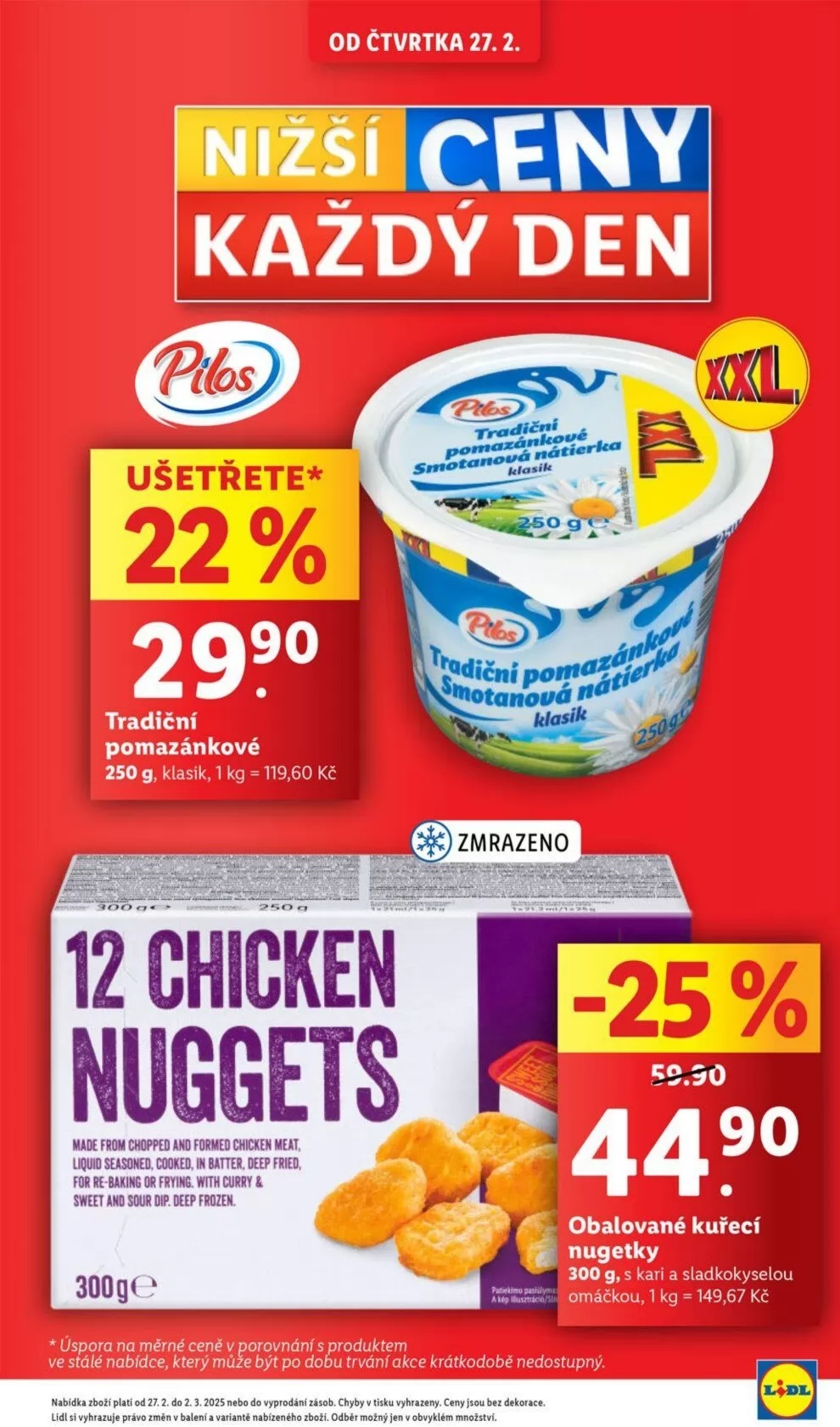 Od čtvrtka 27.2. můžete v obchodě Lidl využít skvělé akce na vybrané produkty. Ušetřete na tradiční pomazánkové, která je k dostání v 250 g balení za cenu 29,90 Kč (1 kg = 119,60 Kč). Dále si můžete pochutnat na oblíbených kuřecích nugetkách, které jsou nyní za akční cenu 44,90 Kč za 300 g (1 kg = 149,67 Kč). Tato nabídka platí do 2.3.2025 nebo do vyprodání zásob. Nezapomeňte, že ceny jsou bez dekorace a Lidl si vyhrazuje právo na změny v balení a variantách nabízeného zboží.