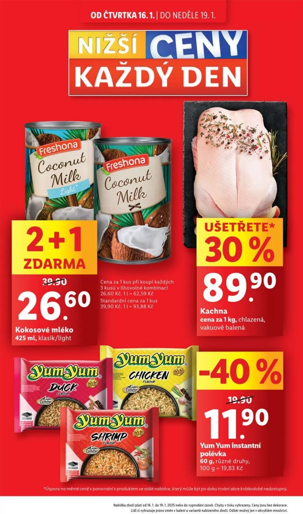 Od čtvrtka 16. ledna do neděle 19. ledna přichází Lidl s atraktivní nabídkou produktů za snížené ceny. V letáku najdete například chlazenou kachnu za cenu 89,90 Kč za kilogram, která je vakuově balená. Dále si můžete pořídit kokosové mléko o objemu 425 ml v variantách klasik a light. Nezapomeňte také na instantní polévky Yum Yum, které jsou k dostání v různých druzích, přičemž cena za 60 g balení je 19,30 Kč. Ušetřete při nákupu a využijte této jedinečné nabídky, která platí do vyprodání zásob!
