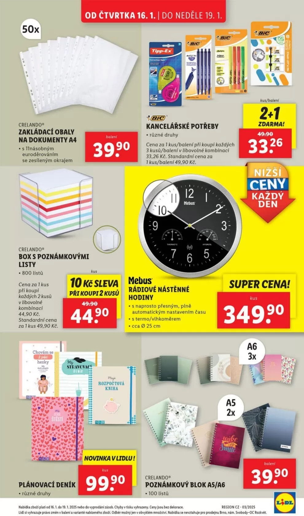 Od čtvrtka 16.1. do neděle 19.1. si v Lidlu můžete pořídit širokou nabídku kancelářských potřeb. Mezi novinkami najdete zakládací obaly na dokumenty A4 s zesíleným okrajem a euroděrováním. Dále nabízíme boxy s poznámkovými bloky za skvělou cenu 39,90 Kč při koupi 3 kusů v libovolné kombinaci.