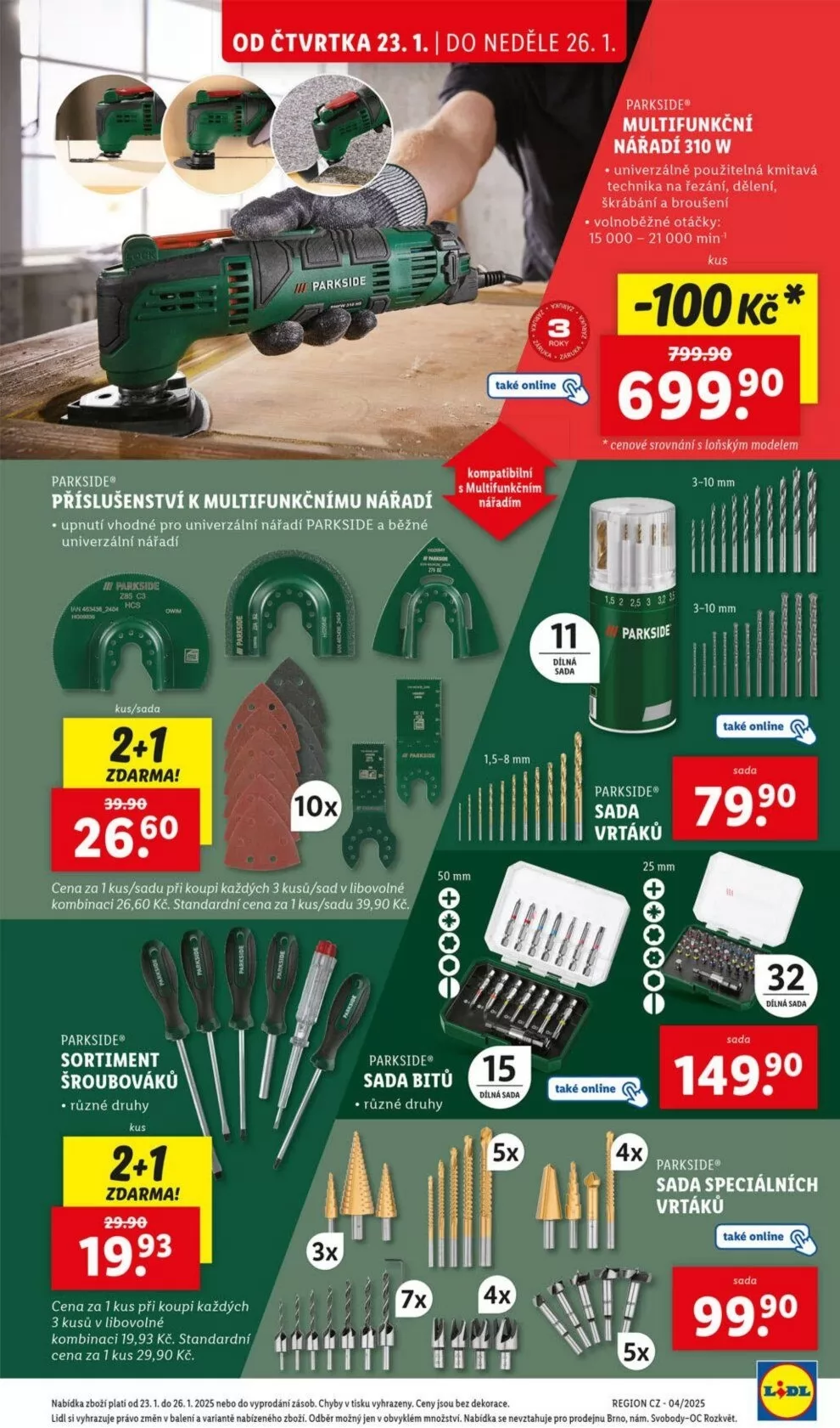 Od čtvrtka 23.1. do neděle 26.1. nabízí Lidl široký sortiment produktů značky Parkside. Mezi hlavními položkami najdete multifunkční nářadí s výkonem 310 W, které je ideální pro řezání, dělení, škrábání a broušení. K dispozici je také příslušenství k multifunkčnímu nářadí, které je kompatibilní s univerzálním nářadím Parkside a dalšími běžnými modely.