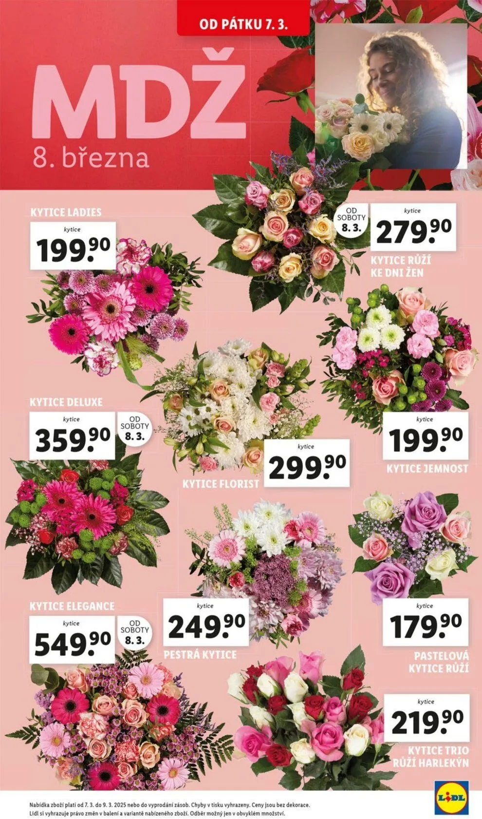Od pátku 7. března oslavujeme Mezinárodní den žen s pestrou nabídkou kytic v obchodě Lidl. V letáku najdete různé varianty, jako například kytici Ladies za 199 Kč, kytici Deluxe od 359,90 Kč, nebo elegantní kytici za 549,90 Kč. Pro milovníky růží máme kytici Jemnost za 219 Kč a kytici Trio za 249 Kč. Nezapomeňte, že nabídka platí od 7. do 9. března 2025, nebo do vyprodání zásob. Ceny jsou uvedeny bez dekorace a Lidl si vyhrazuje právo na změny v balení a variantách zboží. Odběr je možný pouze v obvyklém množství.