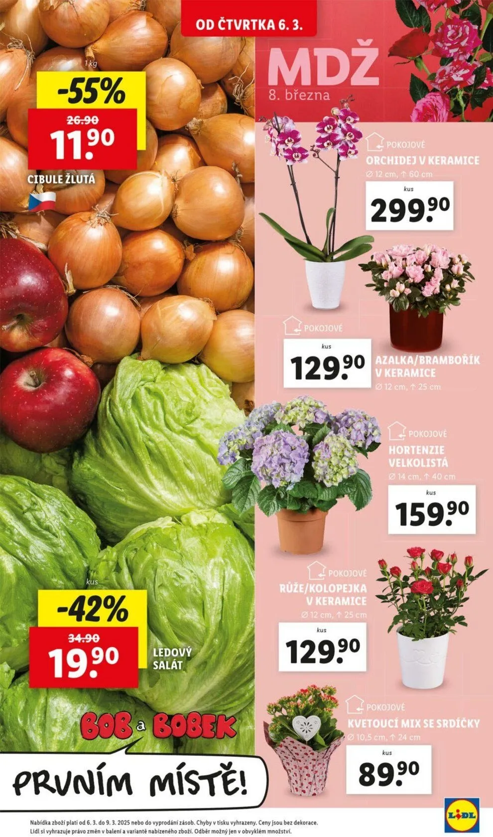 Od čtvrtka 6.3. v obchodě Lidl najdete skvělé nabídky! Pořiďte si pokojovou orchidej v keramice za pouhých 299 Kč, nebo vyzkoušejte žlutou cibuli za 55% slevu. Dalšími lákadly jsou pokojový lmbořik za 129 Kč a velkolistá hortenzie v keramice za 159 Kč. Nezapomeňte také na ledový salát a pokojové růže/kolopejky, které jsou k dostání za 129 Kč. A pro milovníky květin je tu mix srdíček za 89 Kč. Nabídka platí do 9.3.2025 nebo do vyprodání zásob. Těšíme se na vaši návštěvu!