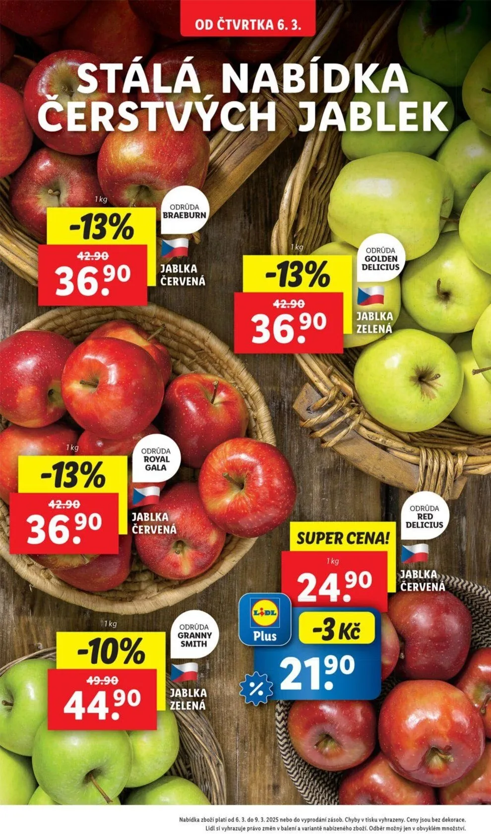 Od čtvrtka 6.3. v Lidlu najdete skvělou nabídku čerstvých jablek. V nabídce jsou různé odrůdy, jako jsou červená jablka Braeburn a Royal Gala, zelená jablka Golden Delicious a Red Delicious, a také Granny Smith. Všechny odrůdy jsou k dispozici za super ceny! Nabídka platí do 9.3.2025 nebo do vyprodání zásob. Nezapomeňte, že ceny jsou bez dekorací a Lidl si vyhrazuje právo na změny v balení a variantách nabízeného zboží. Odběr je možný pouze v obvyklém množství.