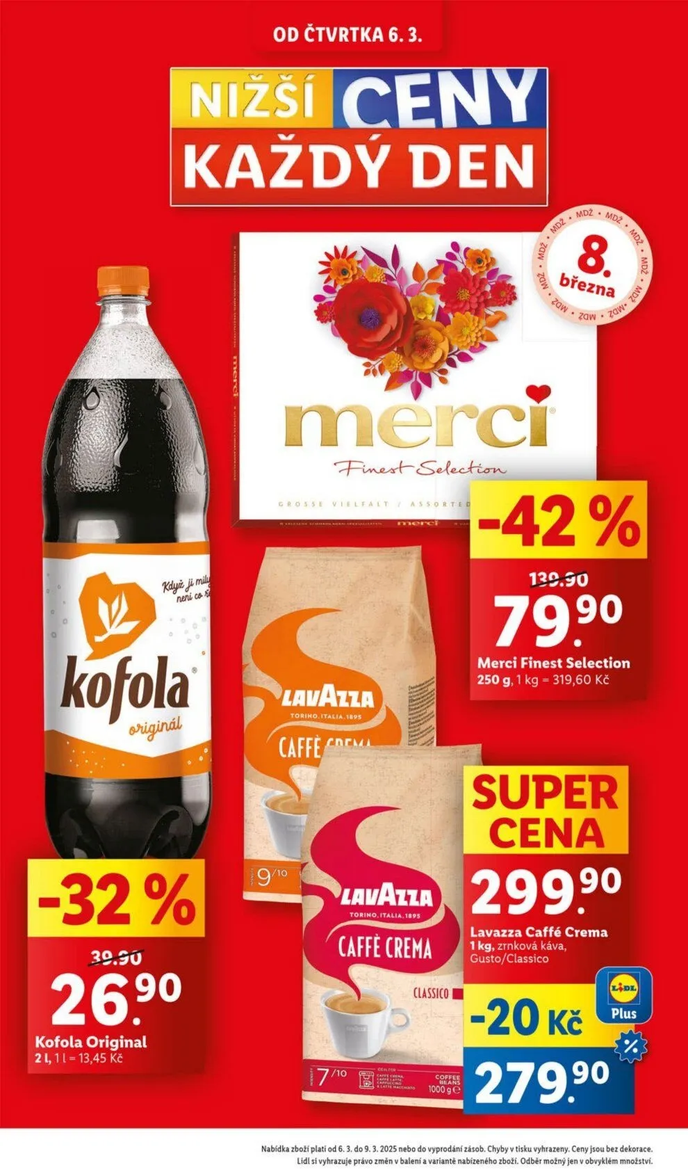Od čtvrtka 6. března přichází Lidl s atraktivními nabídkami! V letáku najdete Kofolu Original za skvělou cenu 13,45 Kč. Dále si můžete dopřát Merci Finest Selection, 250 g za 319,60 Kč za kilogram. Milovníci kávy ocení Lavazza Caffé Crema, zrnkovou kávu, která je nyní za sníženou cenu. Nabídka platí do 9. března 2025 nebo do vyprodání zásob. Nezapomeňte, že ceny jsou bez dekorace a Lidl si vyhrazuje právo na změny v balení a variantách zboží. Odběr je možný pouze v obvyklém množství.