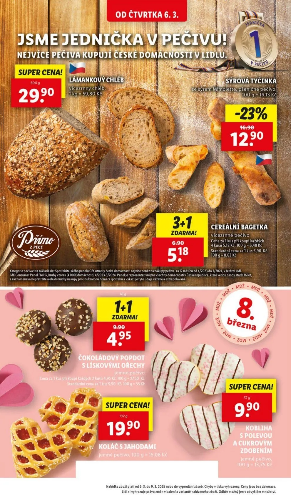 Od čtvrtka 6. března v Lidlu najdete skvělé nabídky na pečivo! Mezi nejzajímavější produkty patří lámankový chléb za super cenu 29,90 Kč za 500 g. Dále si můžete pochutnat na sýrové tyčince, která je k dostání za 12,90 Kč. Nezapomeňte také na cereální bagetku, která je v akci za 5,18 Kč při koupi čtyř kusů.