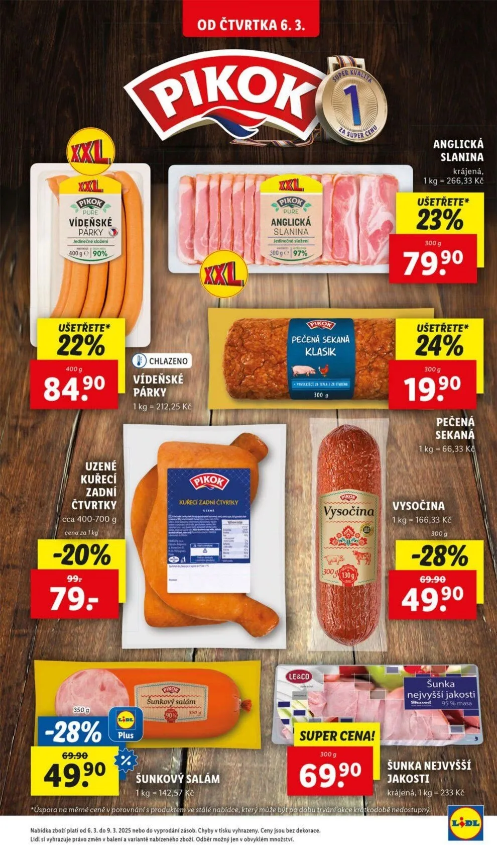 Od čtvrtka 6.3. v obchodu Lidl najdete skvělou nabídku produktů. Můžete si zakoupit anglickou slaninu v balení 350 g za cenu 266,33 Kč/kg. Dále nabízíme uzené kuřecí zadní čtvrtky (cca 400-700 g) se slevou 20%. Nezapomeňte na vídeňské párky, které jsou k dostání v balení 300 g za 212,25 Kč/kg.