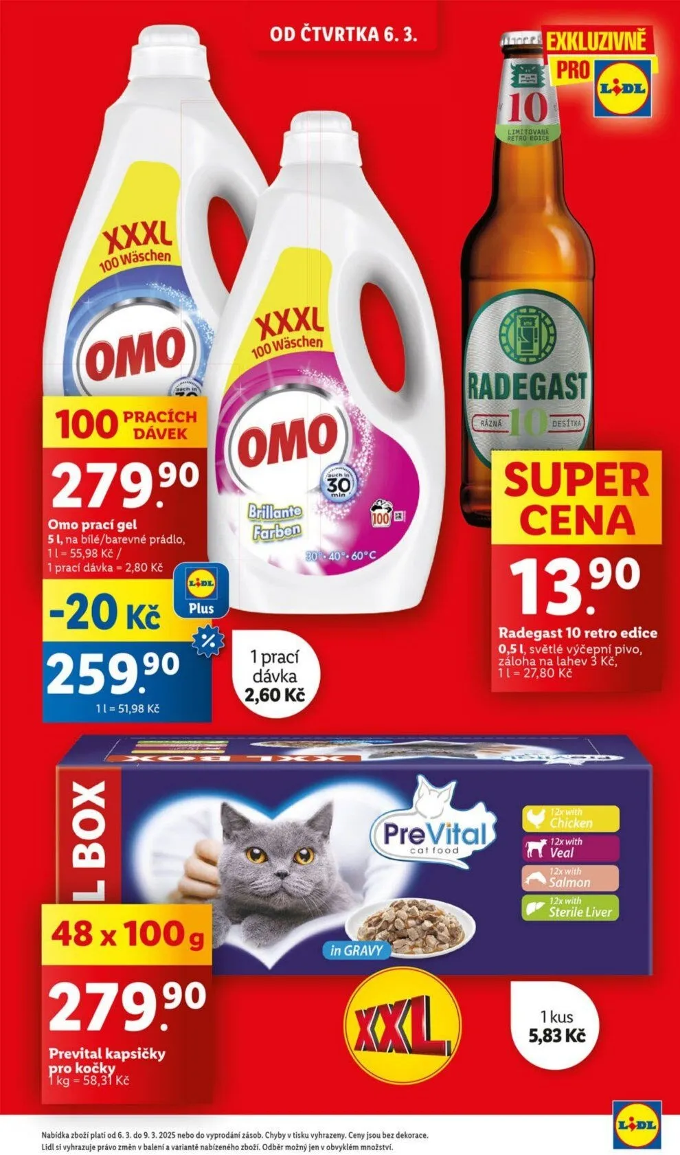 V letáku obchodu Lidl najdete skvělé nabídky na různé produkty. Například prací gel OMO je k dispozici za 279 Kč za 100 pracích dávek, což vychází na 2,80 Kč za dávku. Dále si můžete pořídit světlé výčepní pivo Radegast v retro edici za 13,90 Kč, s zálohou na lahev 3 Kč. Pro majitele koček jsou připraveny kapsičky Prevital, které můžete zakoupit za 5,83 Kč za kus. Nabídka platí od 6.3. do 9.3.2025 nebo do vyprodání zásob. Nezapomeňte, že ceny jsou bez dekorací a Lidl si vyhrazuje právo na změny v balení a variantách zboží.