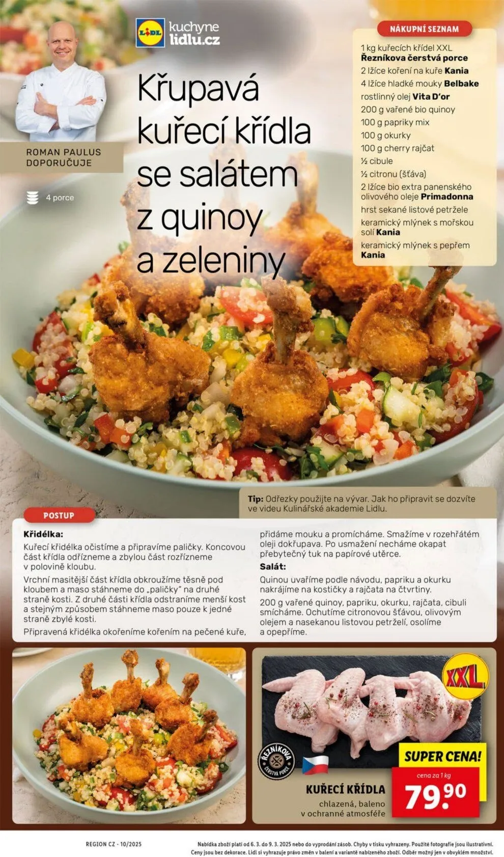 V letáku obchodu Lidl najdete skvělou nabídku na kuřecí křídla, která jsou ideální pro přípravu chutného jídla pro čtyři porce. Křupavá kuřecí křídla můžete podávat se salátem z quinoy a čerstvé zeleniny. Na nákupním seznamu najdete 1 kg kuřecích křídel, koření na kuře, hladkou mouku, rostlinný olej, bio quinou, papriku, okurku, cherry rajčata, cibuli, citron, olivový olej a čerstvou petržel.