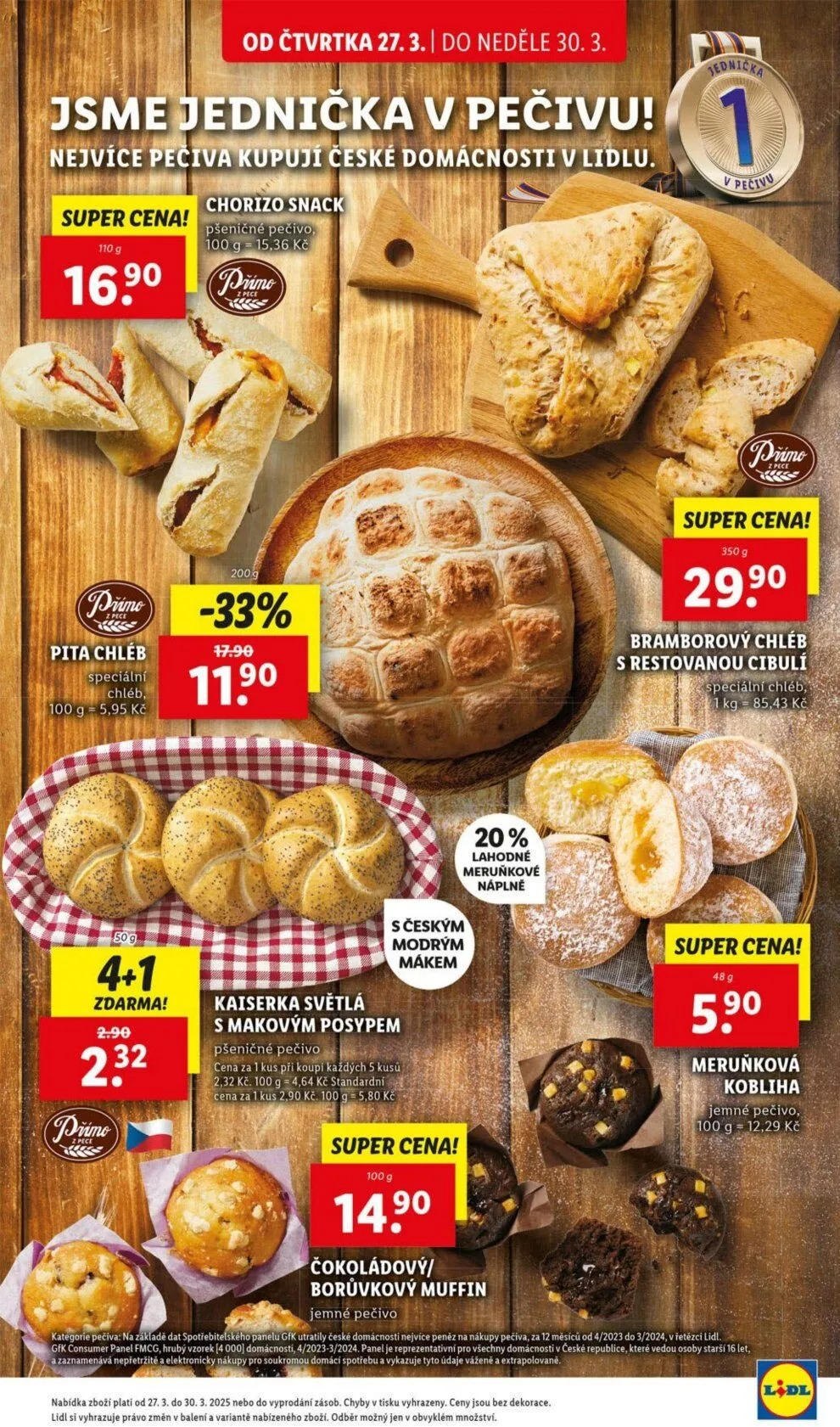 Od čtvrtka 27.3. do neděle 30.3. přichází Lidl s jedinečnou nabídkou pečiva! V akci najdete lahodné chorizo snack za super cenu 15,36 Kč za 100 g. Nezapomeňte také na pita chléb, který je k dostání za 5,95 Kč za 100 g.
