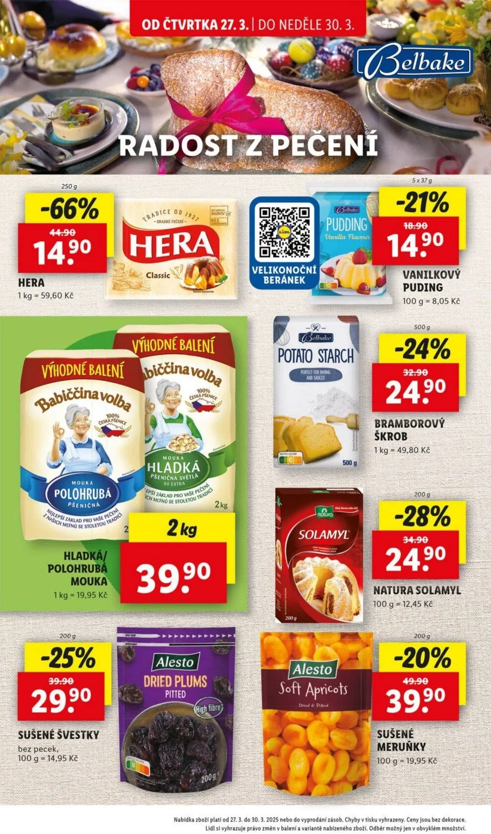 Od čtvrtka 27.3. do neděle 30.3. si nenechte ujít skvělé nabídky v obchodě Lidl! V letáku najdete výhodné balení mouky, a to jak hladké, tak polohrubé, za skvělou cenu 19,95 Kč za kilogram. Dále nabízíme sušené švestky bez pecek za 14,95 Kč za 200 g. Pro milovníky sladkostí máme také vanilkový puding a bramborový škrob, které jsou nyní v akci. Nezapomeňte také na velikonočního beránka a sušené meruňky, které potěší každého. Nabídka platí do vyprodání zásob, tak neváhejte a přijďte si vybrat!