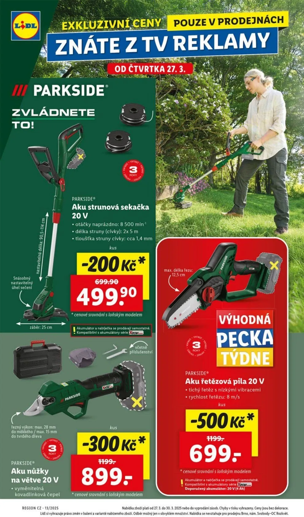 V letáku obchodu Lidl najdete exkluzivní nabídku produktů značky Parkside, které jsou k dispozici pouze v prodejnách. Od čtvrtka 27. března si můžete pořídit aku strunovou sekačku s výkonným motorem a nastavitelným úhlem sečení za zvýhodněnou cenu. Dále jsou v nabídce aku nůžky na větve, které jsou kompatibilní s akumulátory série Parkside.