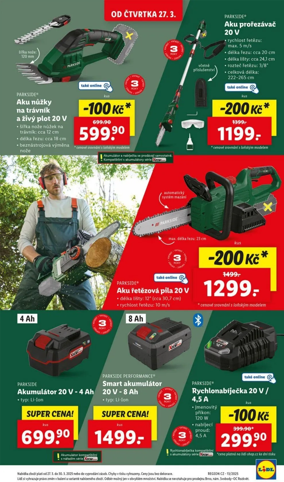 Od čtvrtka 27.3. v obchodě Lidl najdete skvělé produkty pro zahradu. Mezi nimi jsou akumulátorové nůžky na trávník a živý plot Parkside s šířkou nože 120 mm a beznástrojovou výměnou nože. Dále nabízíme akumulátorový prořezávač Parkside s maximální rychlostí řetězu 5 m/s a délkou řezu 20 cm.