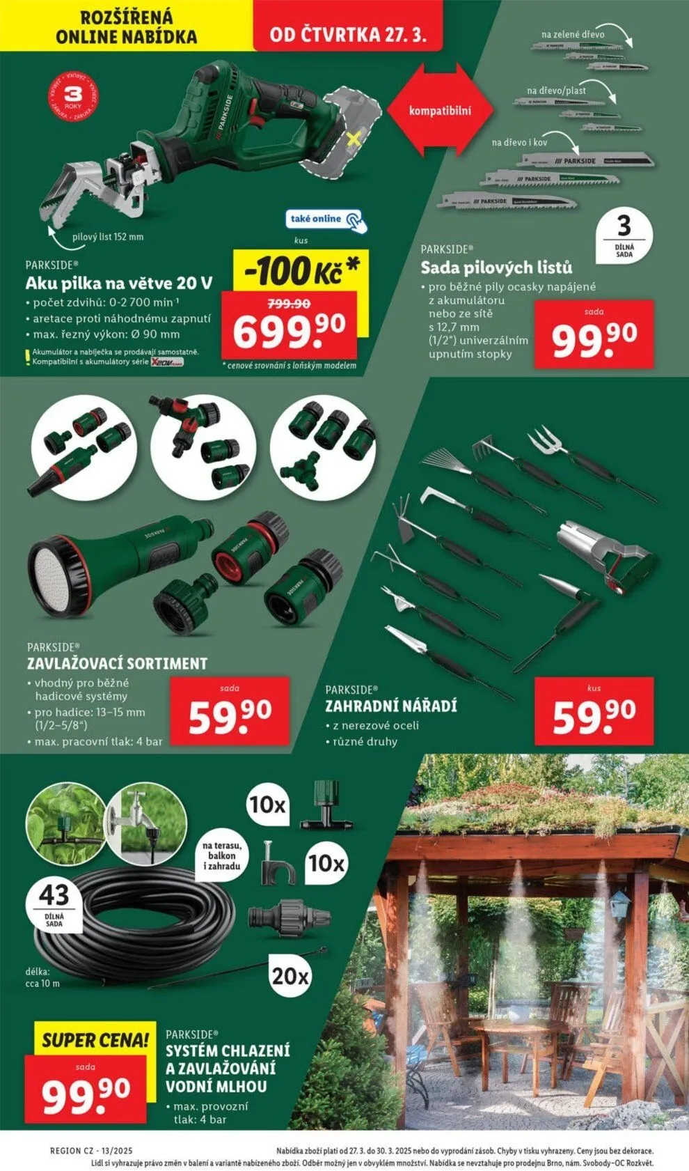 V letáku obchodu Lidl najdete širokou nabídku produktů, které potěší každého zahrádkáře a kutily. Od čtvrtka 27. března si můžete pořídit aku pilku na větve Parkside s počtem zdvihů až 2 700 a aretací proti náhodnému zapnutí. K dispozici je také sada pilových listů pro běžné pily ocasky, ideální pro řezání dřeva, plastu i kovu.