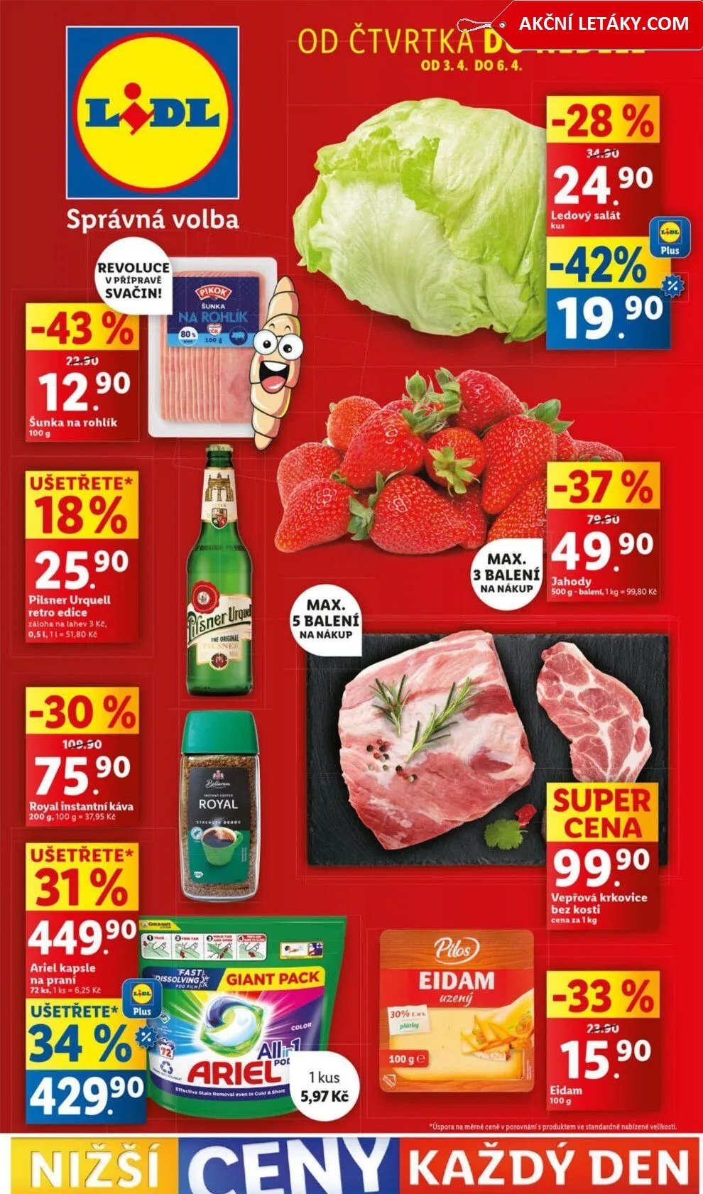 V letáku obchodu Lidl najdete skvělé nabídky, které potěší každého zákazníka. Od čtvrtka do neděle, od 3.4. do 6.4., můžete ušetřit až 43 % na ledovém salátu a 30 % na Pilsner Urquell v retro edici. Nezapomeňte také na šunku na rohlík, která je nyní za výhodnou cenu 25,90 Kč.