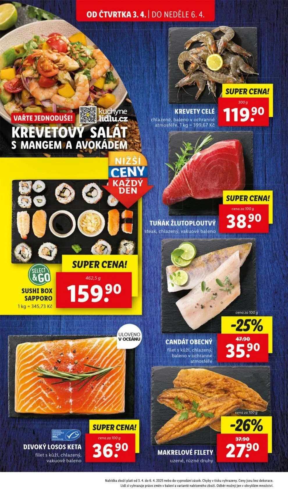 Od čtvrtka 3.4. do neděle 6.4. přichází Lidl s výhodnými nabídkami! V letáku najdete chlazené krevety celé, balené v ochranné atmosféře, za skvělou cenu 399,67 Kč za 1 kg. Dále si můžete pochutnat na tuňákovém steaku, chlazeném a vakuově baleném, za 345,73 Kč za 1 kg. Nezapomeňte také na sushi box Sapporo a křevetový salát s mangem a avokádem.