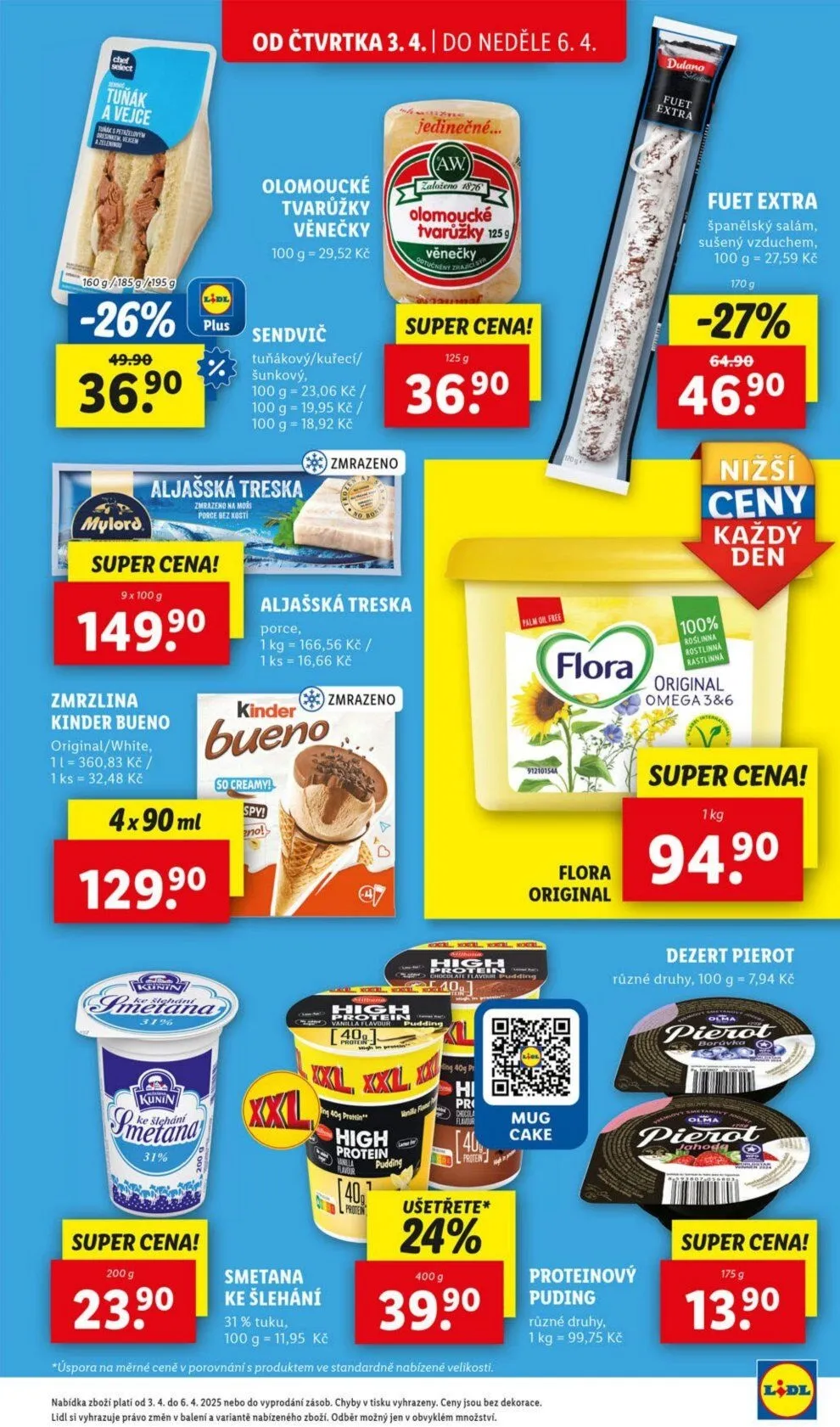 Od čtvrtka 3.4. do neděle 6.4. si nenechte ujít skvělé nabídky v Lidlu! V letáku najdete olomoucké tvarůžky a věnečky za výhodné ceny. Tuňákové, kuřecí a šunkové sendviče jsou také v akci. Zmrazená aljašská treska je k dostání za skvělou cenu, stejně jako španělský salám fuet extra.
