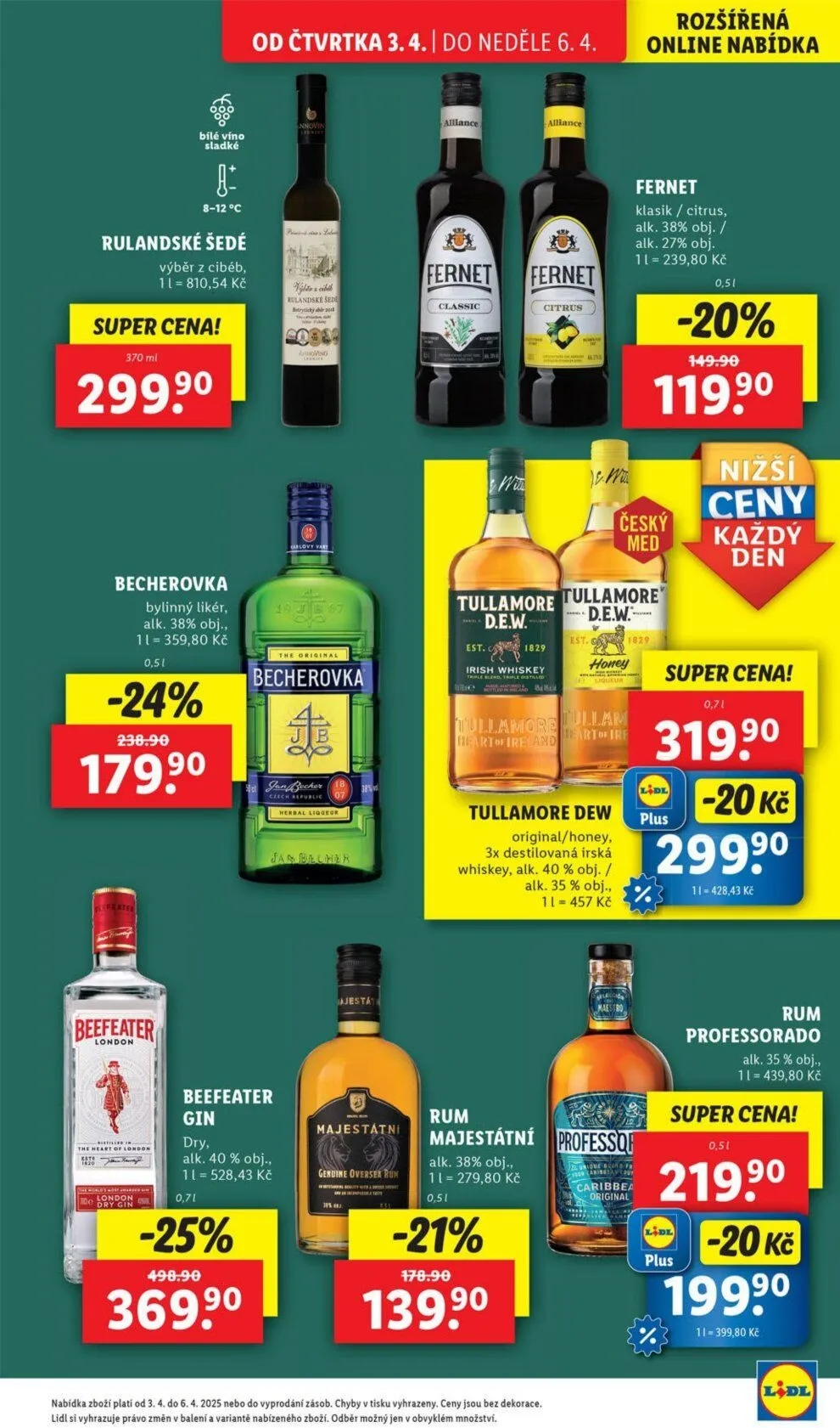 Od čtvrtka 3.4. do neděle 6.4. máte možnost zakoupit skvělé produkty v obchodě Lidl! V nabídce najdete bílé víno Rulandské šedé za super cenu 299 Kč. Dále si můžete vychutnat bylinný likér Becherovka za 179 Kč a fernet v různých variantách za 119 Kč.