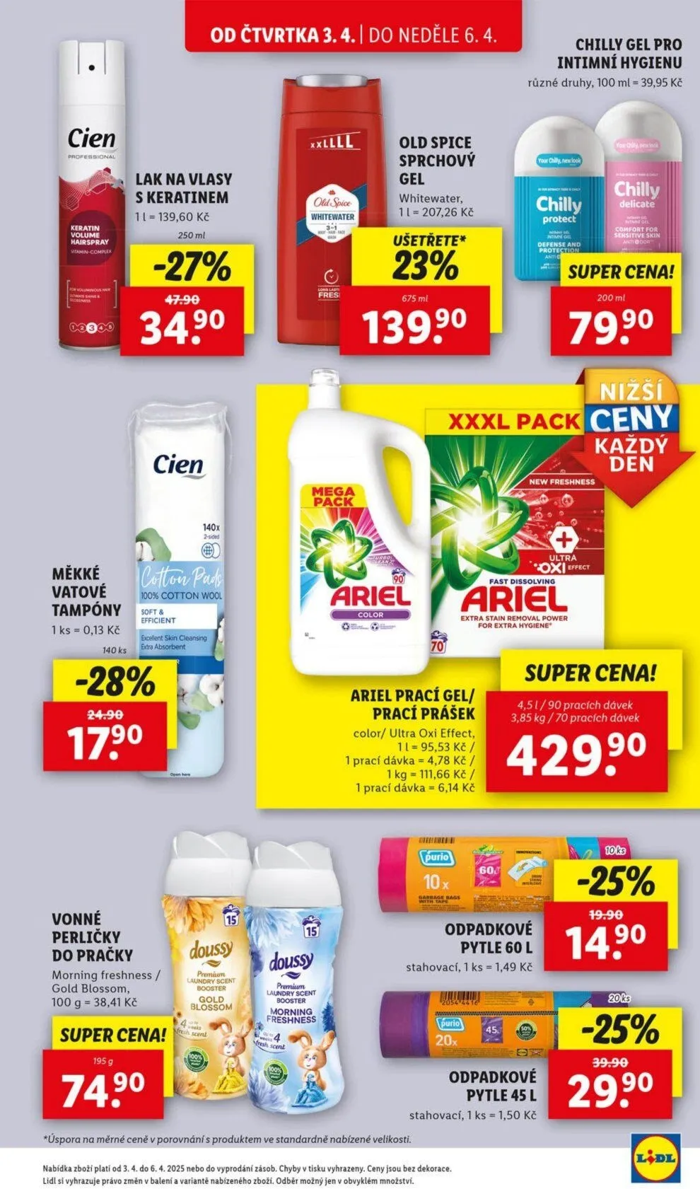 Od čtvrtka 3.4. do neděle 6.4. si nenechte ujít skvělé nabídky v Lidlu! V letáku najdete měkké vatové tampóny za pouhých 0,13 Kč za kus. Pro milovníky krásy je tu lak na vlasy s keratinem za 139,60 Kč (250 ml) se slevou 27%.