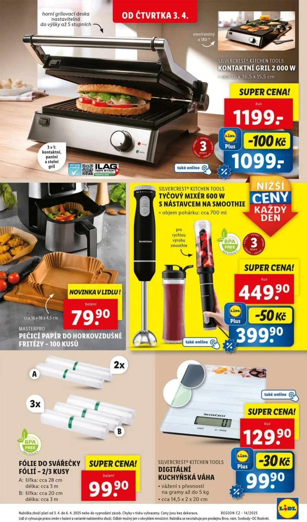 V letáku obchodu Lidl najdete skvělou nabídku produktů pro vaši kuchyni! Od čtvrtka 3.4. si můžete pořídit horní grilovací desku, která je nastavitelná do výšky až 5 stupňů a nabízí 3v1 funkce: kontaktní, panini a stolní gril. Tento gril je k dispozici také online za super cenu 1199 Kč.