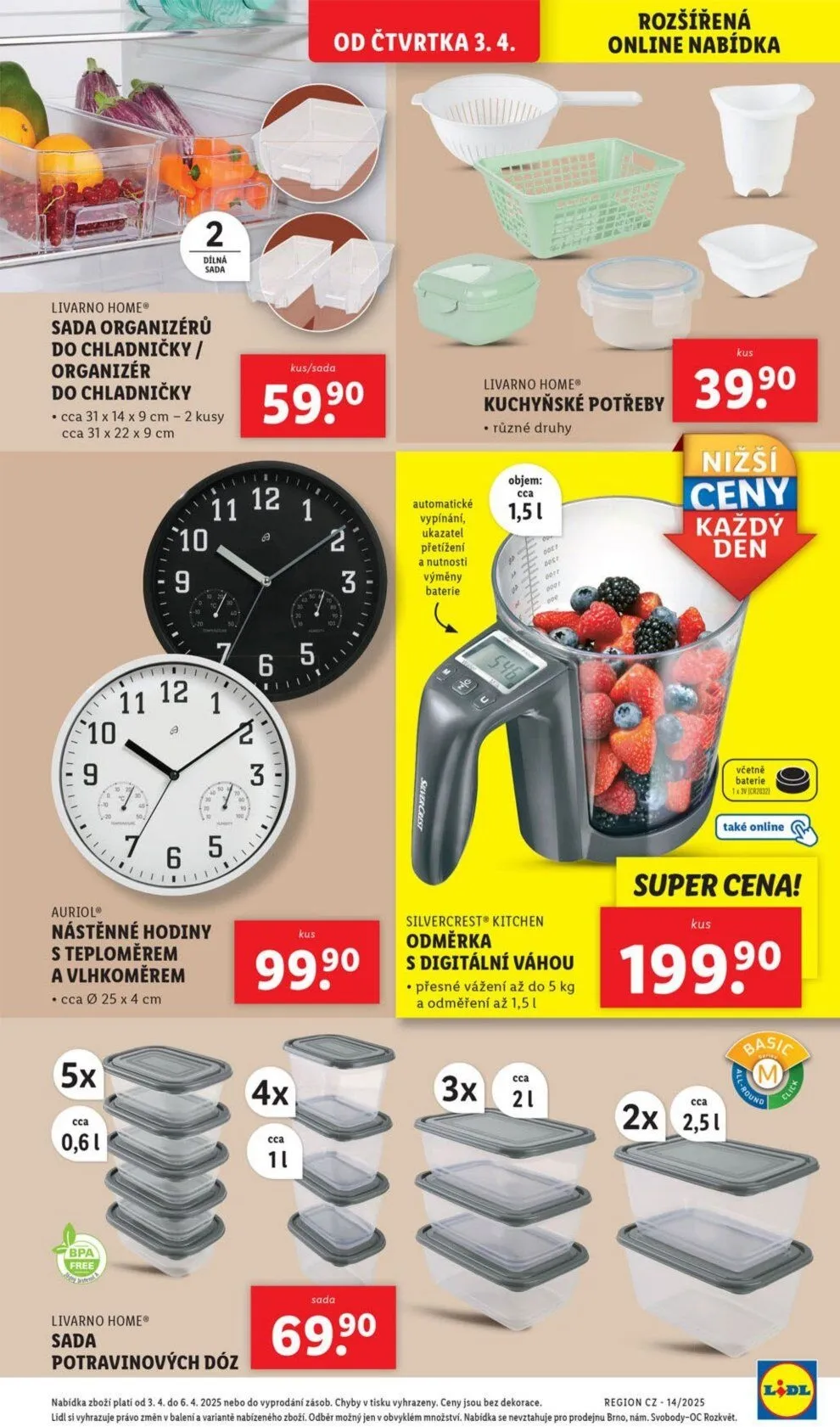 Od čtvrtka 3.4. si můžete v Lidlu pořídit rozšířenou online nabídku. Mezi novinkami najdete sadu organizérů do chladničky, která obsahuje dva kusy v různých velikostech. Dále nabízíme nástěnné hodiny s teploměrem a vlhkoměrem, které skvěle doplní váš interiér.