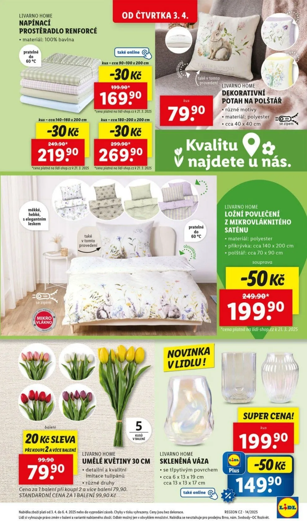 V letáku obchodu Lidl najdete širokou nabídku produktů značky Livarno Home. Od čtvrtka 3.4. si můžete pořídit napínací prostěradlo renforcé vyrobené ze 100% bavlny v různých velikostech, které jsou měkké a hebké s elegantním leskem. K dispozici jsou také dekorativní potahy na polštáře s různými motivy, vyrobené z polyesteru, a skleněné vázy se třpytivým povrchem.
