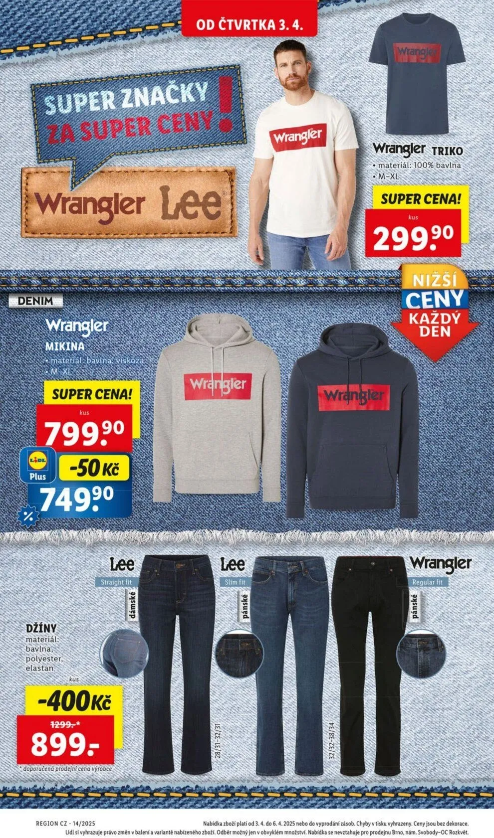 Od čtvrtka 3.4. v obchodě Lidl najdete skvělé produkty značky Wrangler! V nabídce je například stylové triko z 100% bavlny za super cenu 299 Kč. Nezapomeňte také na další produkty, které jsou nyní za akční ceny, jako například výrobky Wrangler s cenovým snížením o 50 Kč. Tato nabídka platí do 6.4.2025 nebo do vyprodání zásob. Navštivte nás a využijte skvělé příležitosti!
