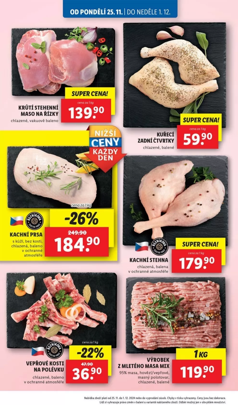 Od pondělí 25.11. do neděle 1.12. si můžete v Lidlu pořídit skvělé masné produkty. Nabízíme krůtí stehenní maso na řízky, chlazené a vakuově balené. Dále kachní prsa s kůží, bez kosti, také chlazená a balená v ochranné atmosféře. Nezapomeňte na vepřové kosti na polévku, které jsou rovněž chlazené a balené v ochranné atmosféře.